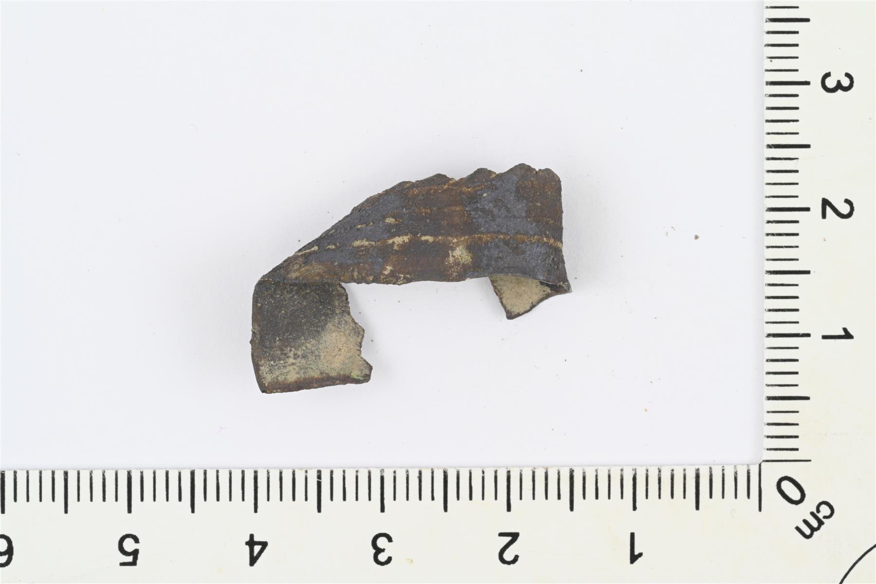 | Kupariseoslevyn suikale, jonka toinen pitkä sivu sahalaitainen. Etupuolella pitkittäisiä viivauurteita. | |