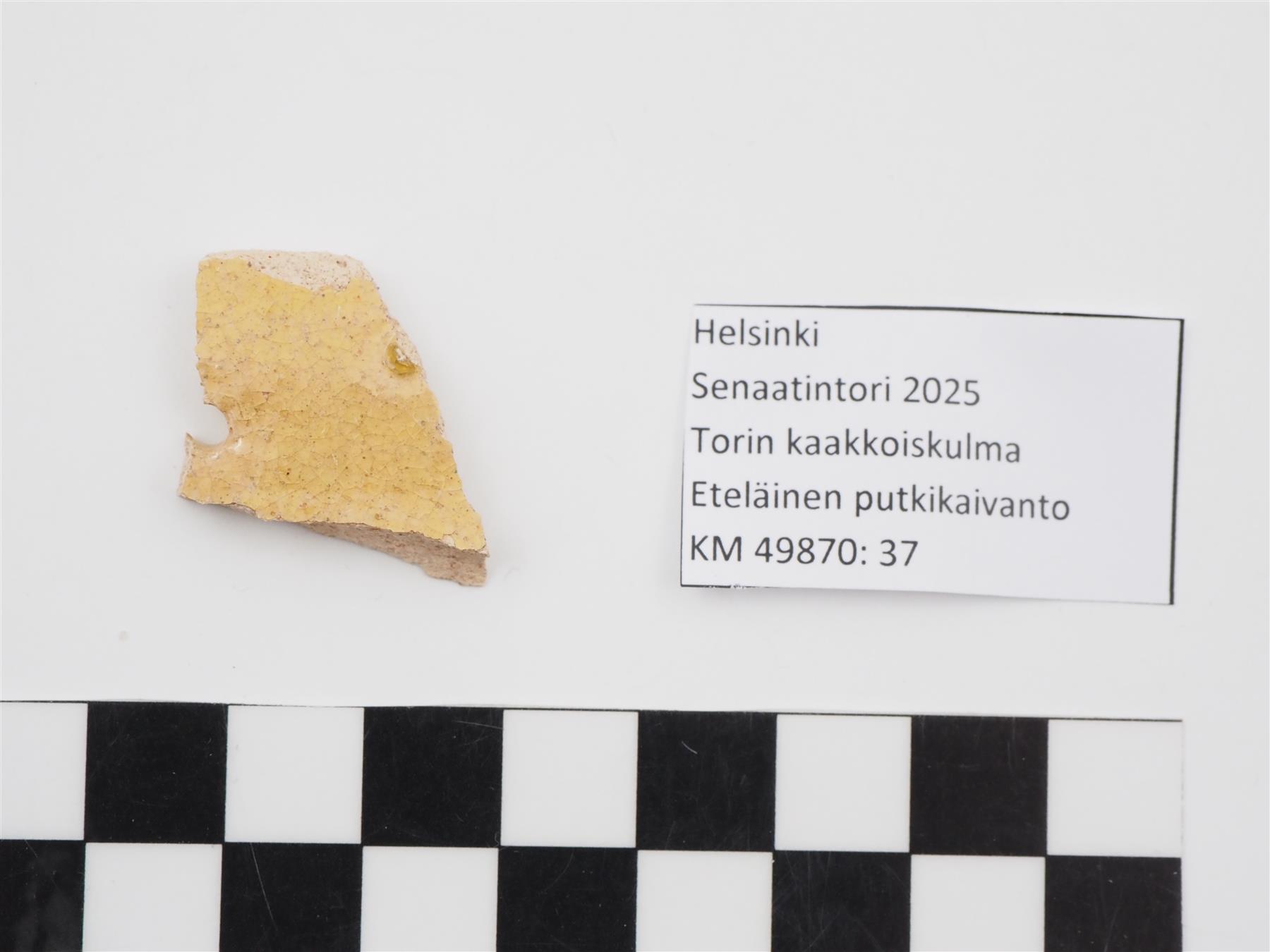 | Valkosavisen astian pala. Molemmilla pinnoilla keltainen lyijylasite. Toisella puolella pieni reikä. | |