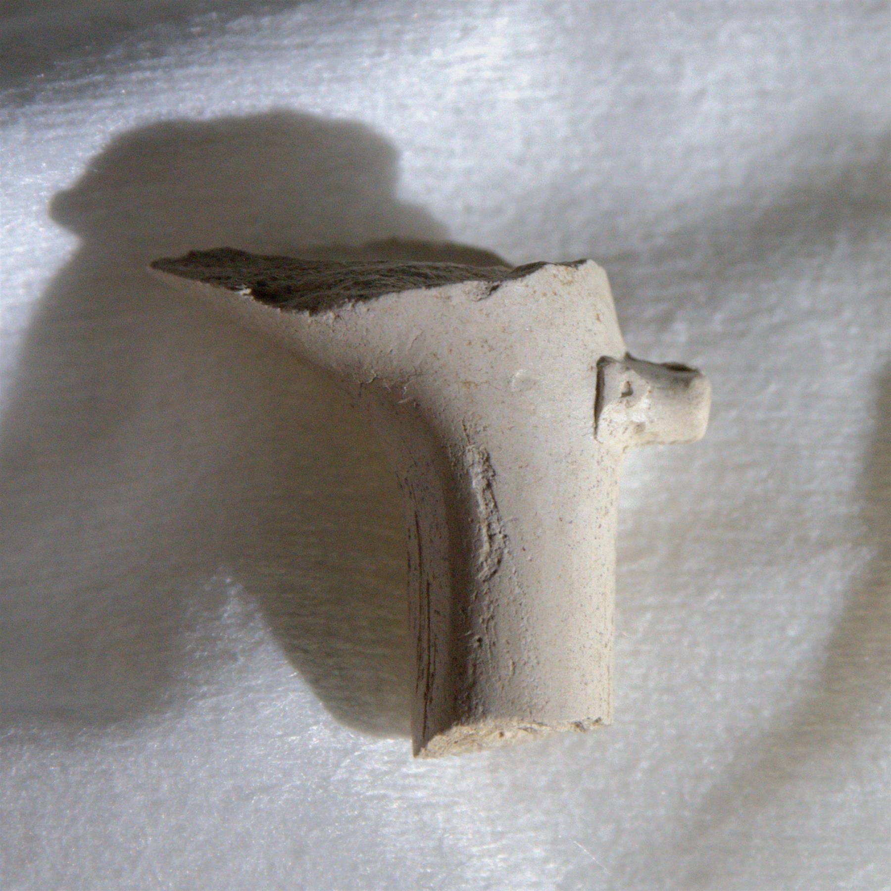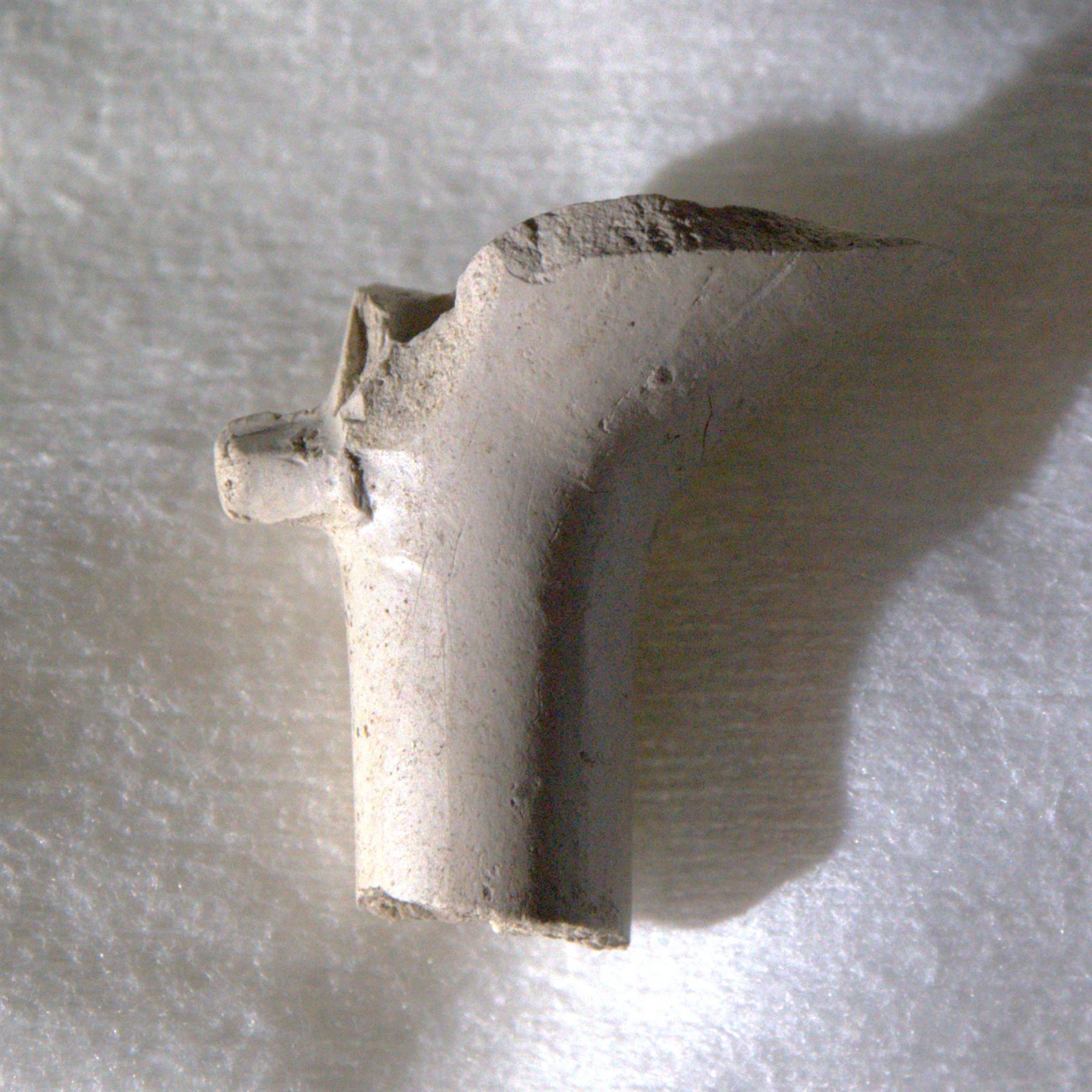 | Liitupiipun kanta ja kylkeä. Kanta ohut, sivuilla pienet kirjaimet P ja I. Todennäköisesti englantilainen piippu 1700-vuosisadan puolivälistä. | |