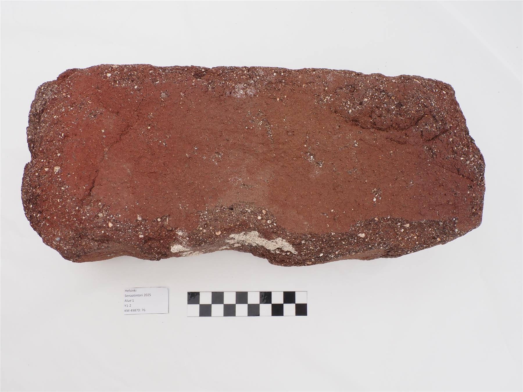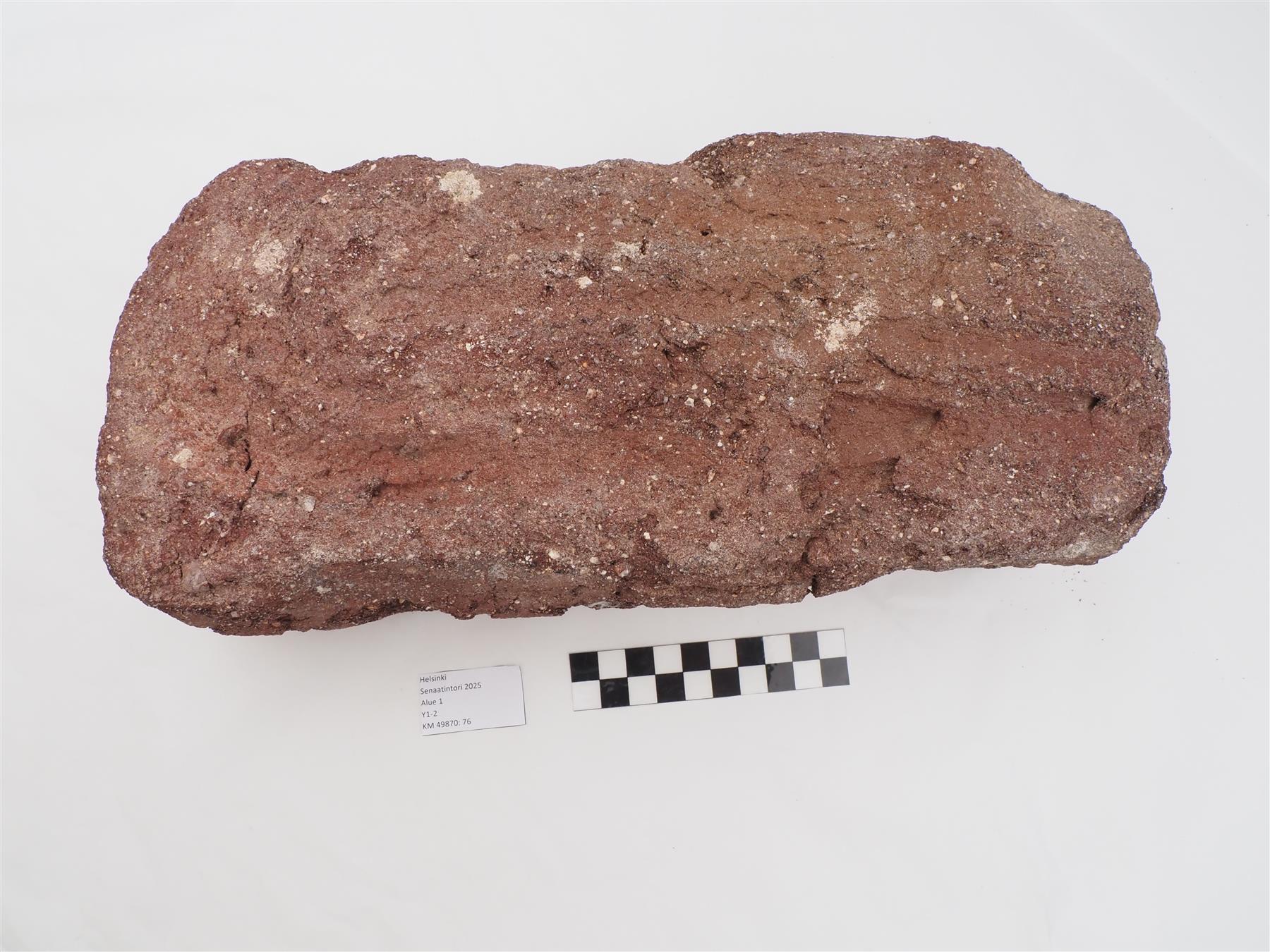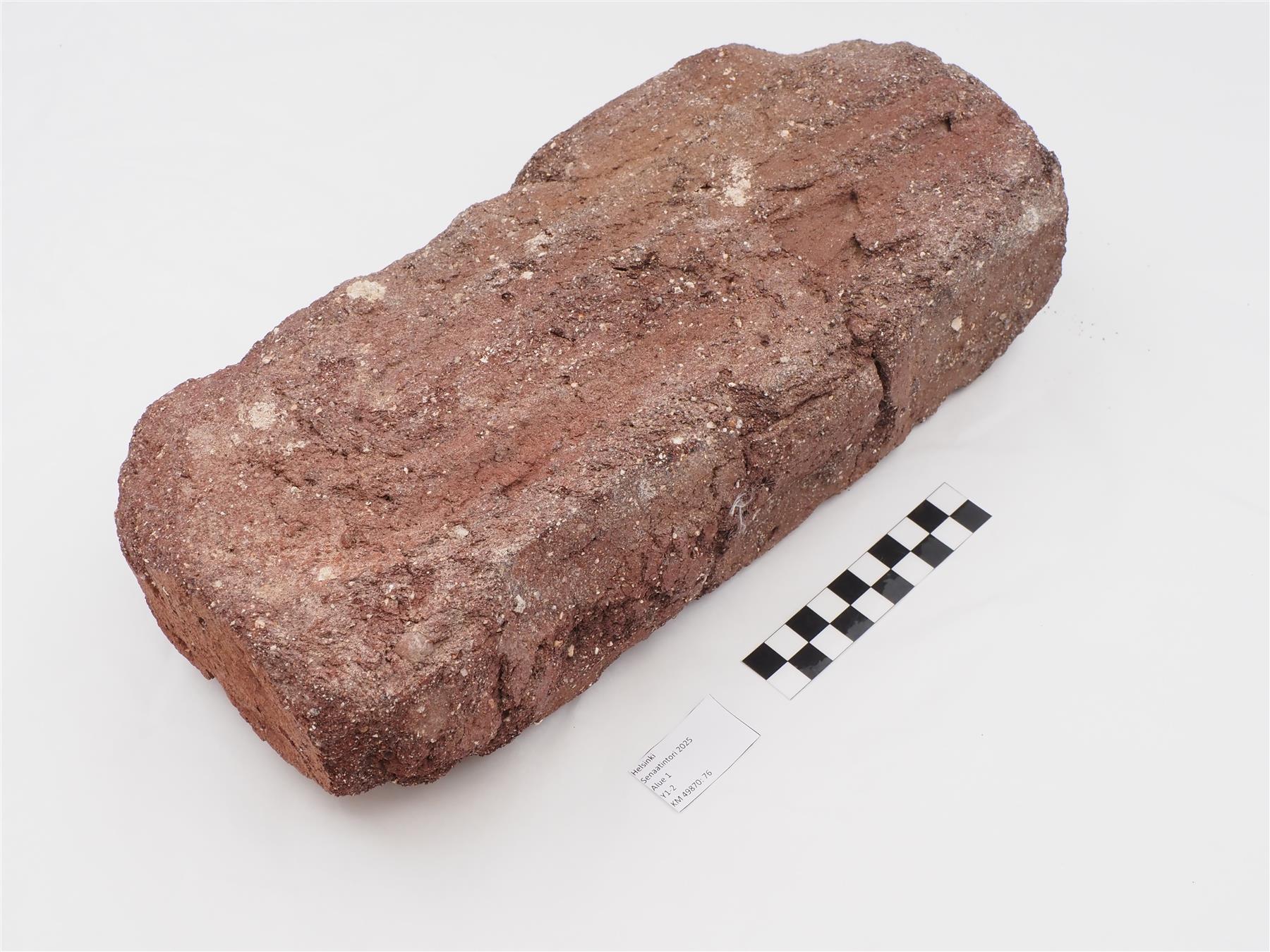 | Kokonainen punasavinen tiili. Pinnat kuluneet. Karkea sekoite, tummanpunainen savimassa. | |