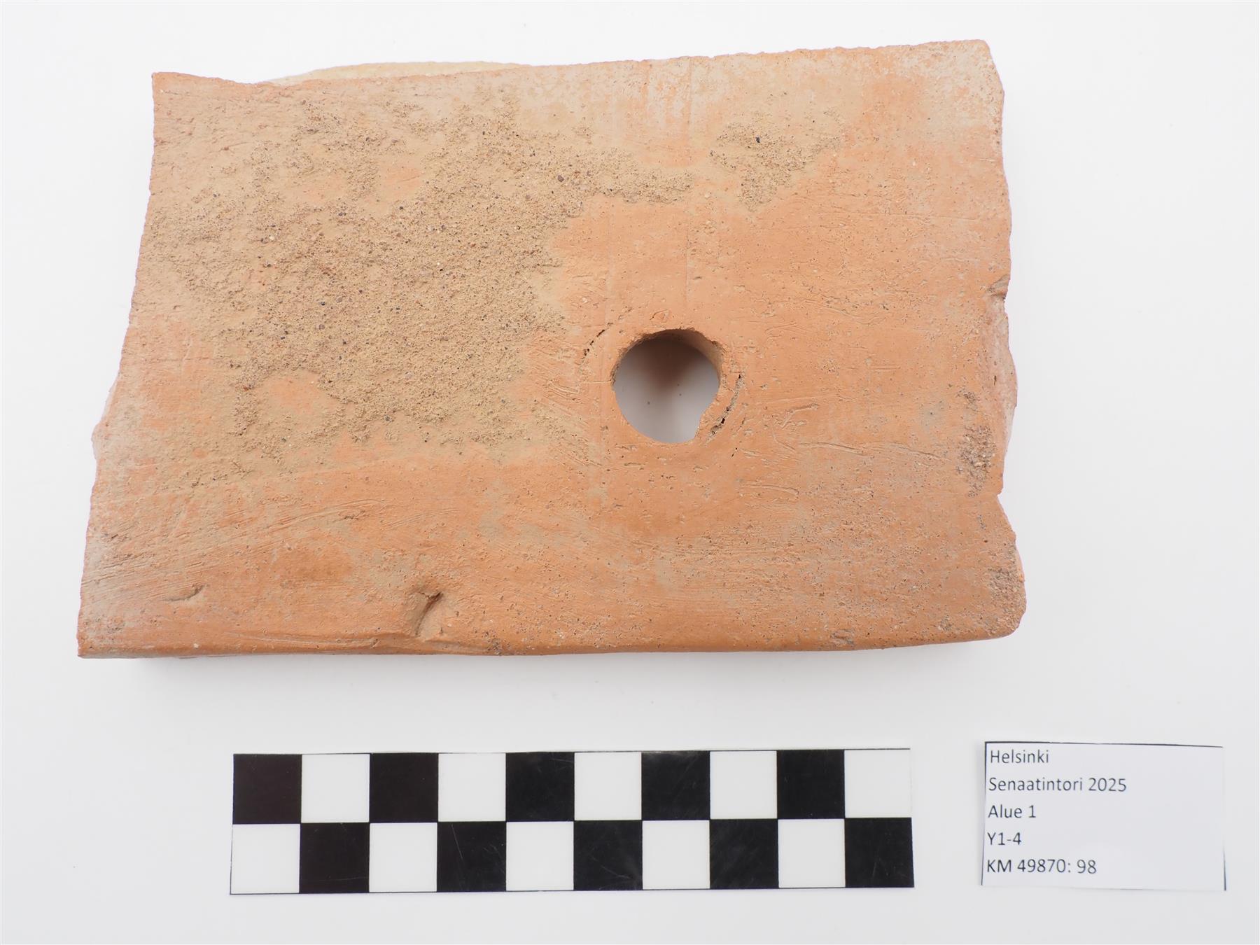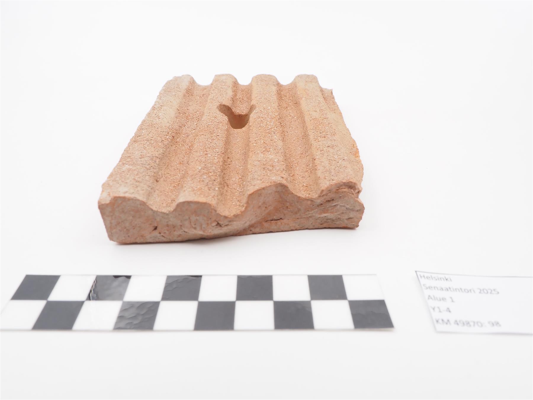| Punasavisen kaakelin kappale. Toisella pinnalla syvää suurikokoista rihlausta, pinta karhea. Toinen pinta tasainen. Keskellä kaakelia reikä. | |