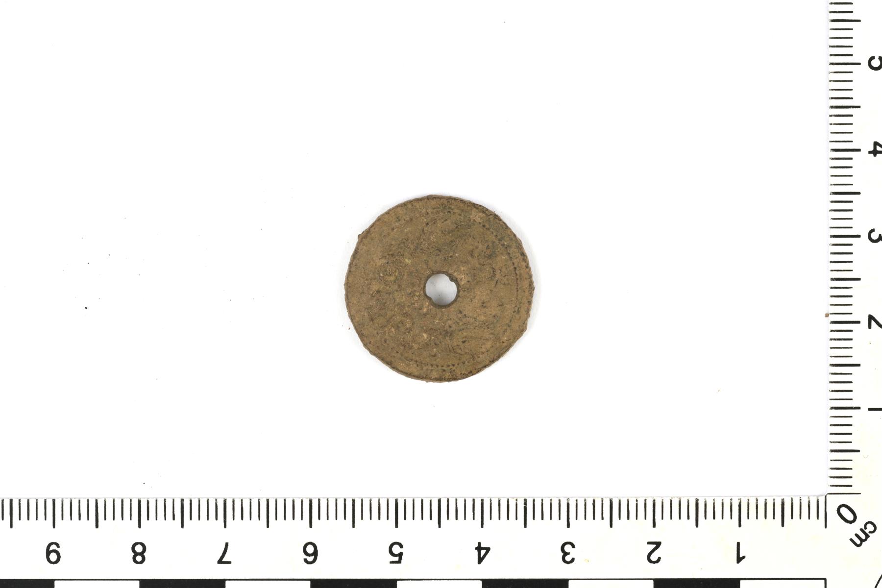 | Reiällinen metallilevy. Yhdellä puolella on kasviornamentiikkaa. | |