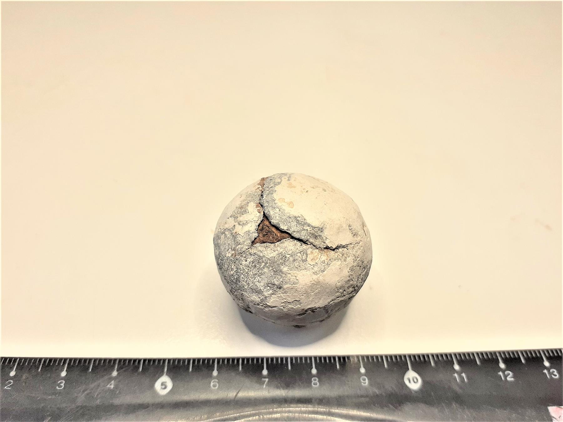 | Lähes pyöreä tykin rautakuula, jonka pinta päällystetty lyijyllä. | |
