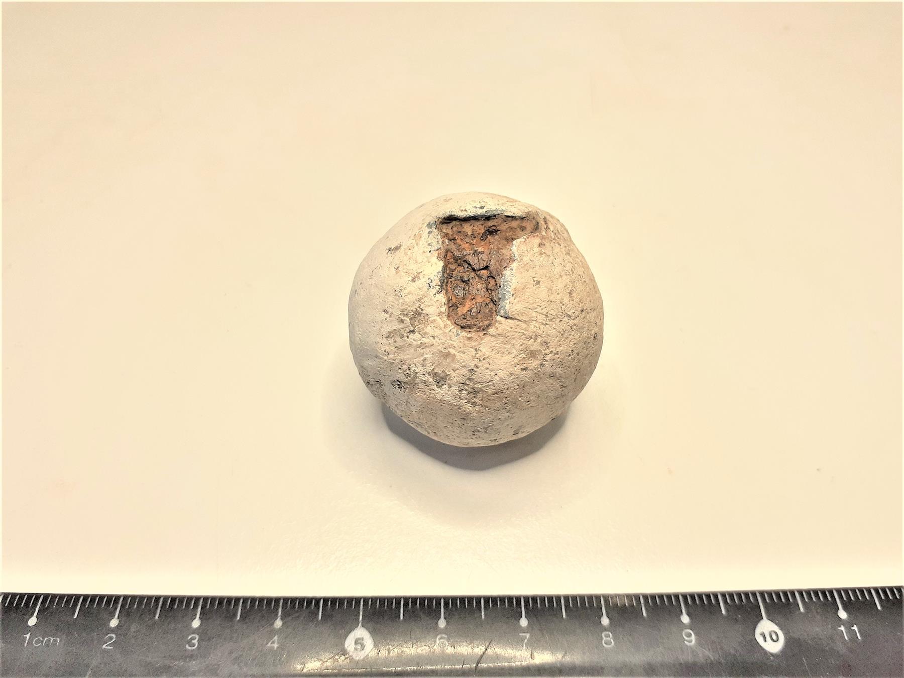 | Lähes pyöreä tykin rautakuula, jonka pinta päällystetty lyijyllä. | |