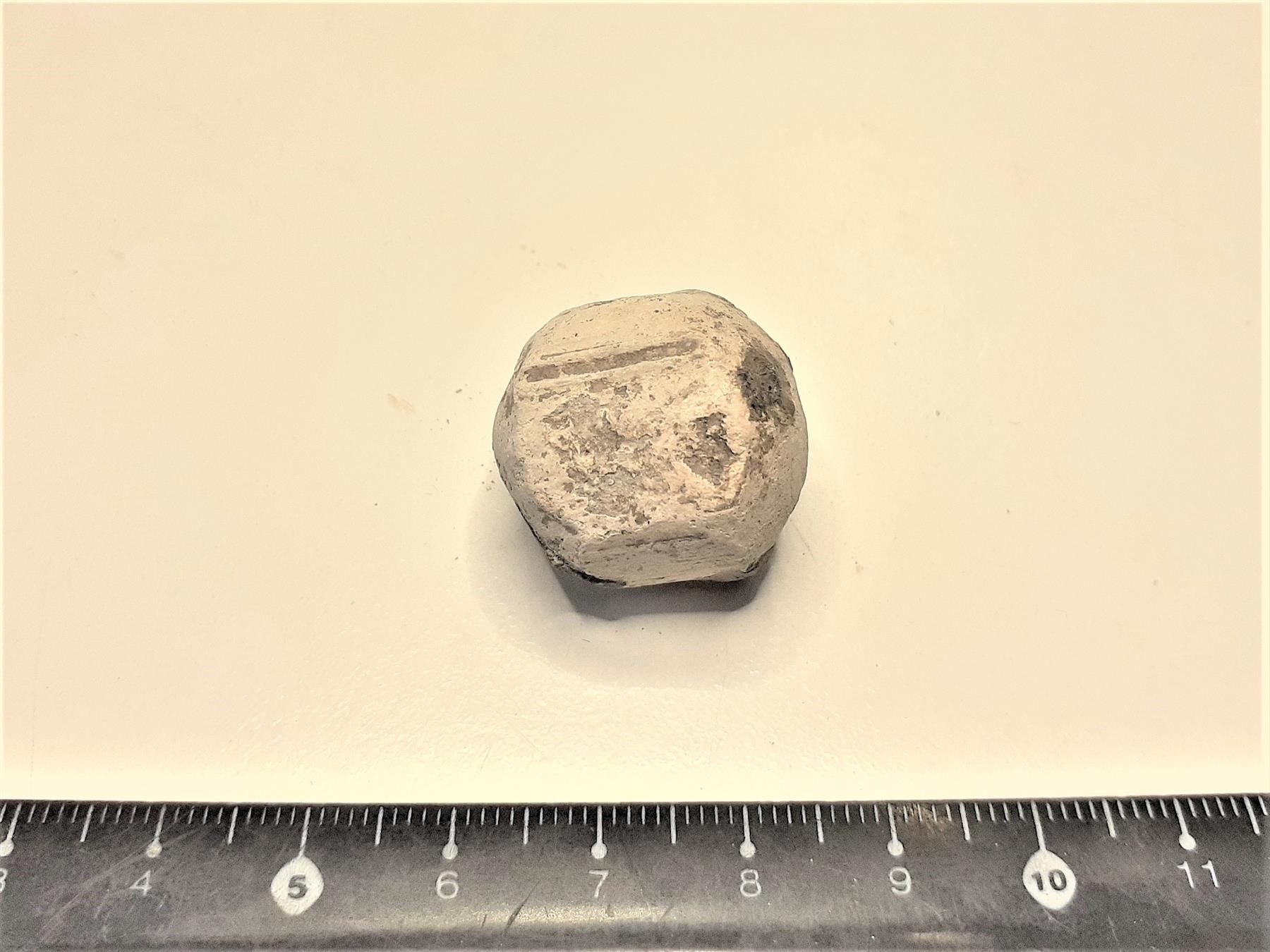| Lähes pyöreä, osittain pinnoiltaan suora lyijykuula, jonka sisällä kivi. Todennäköisesti hakapyssystä (tupla- tai yksöishaka). | |