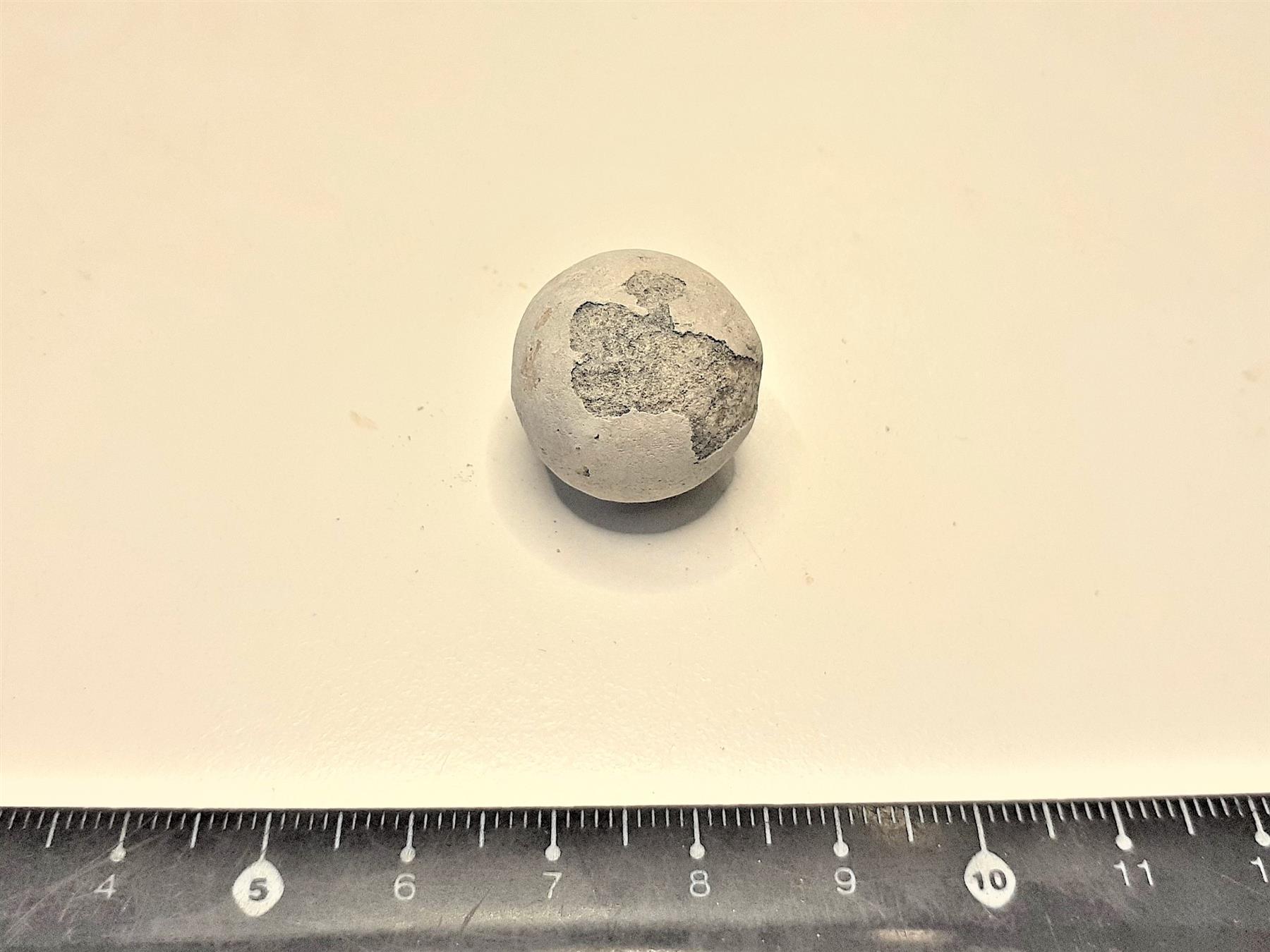 | Lähes pyöreä lyijykuula, jonka sisällä kivi. Todennäköisesti hakapyssystä (tupla- tai yksöishaka). | |