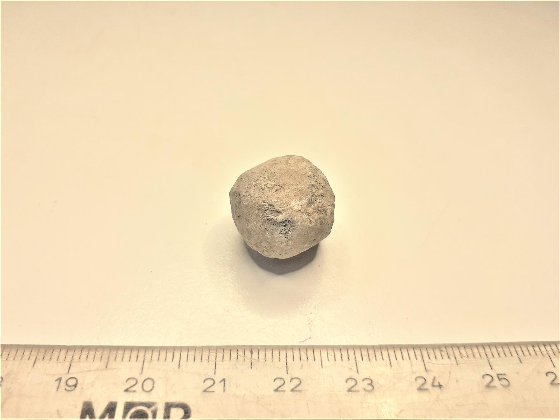 | Melko pyöreä, pinnoilta epätasainen lyijykuula. Todennäköisesti hakapyssystä tai käsituliaseesta. | |