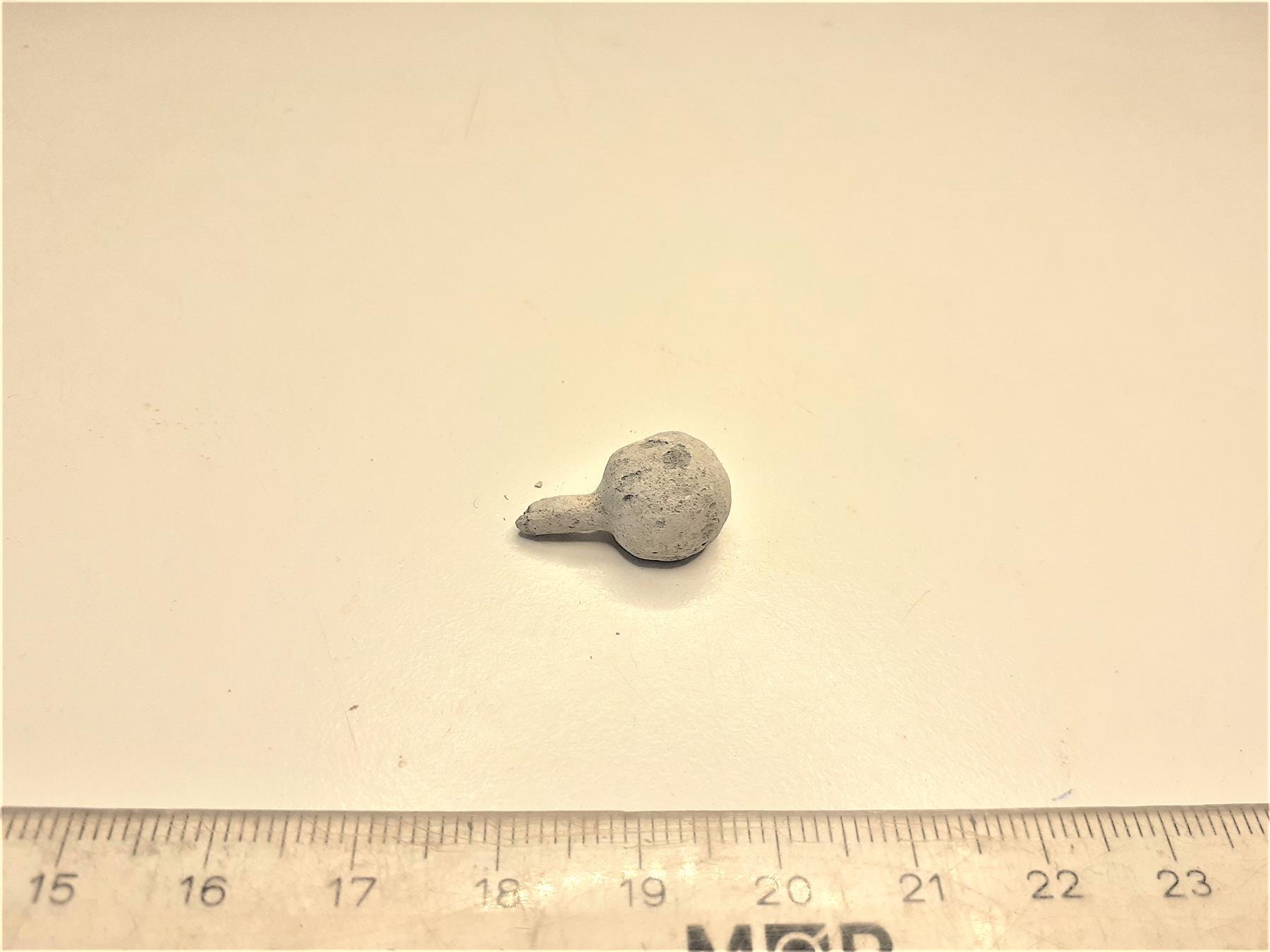 | Pyöreä käsituliaseen lyijykuula, jossa valutappi. | |