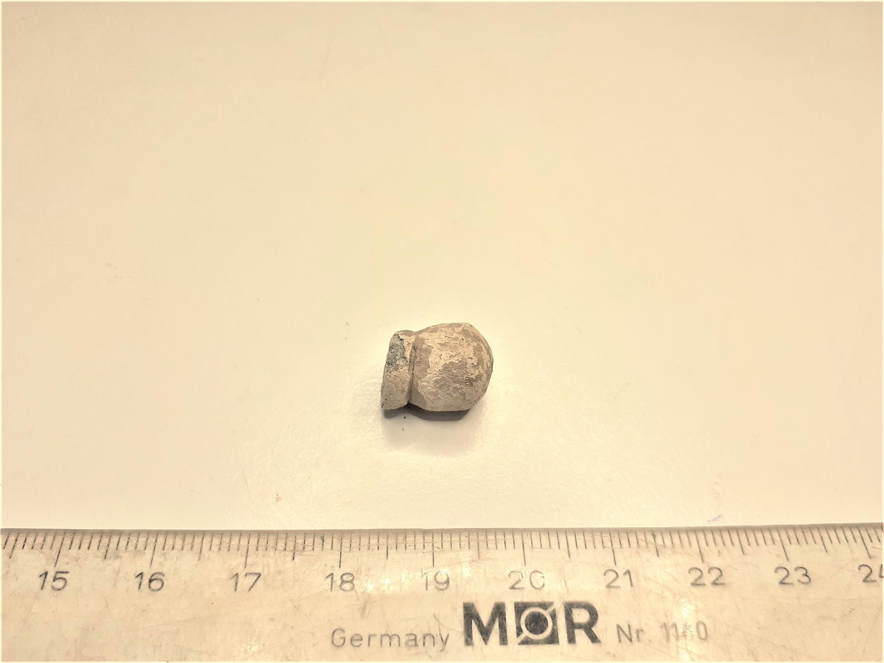 | Lieriömäinen, päästä pyöreä kuulaa muistuttava kappale, jossa toinen pää suoraksi murtunut ja sen lähellä esinettä kiertävä ura. | |