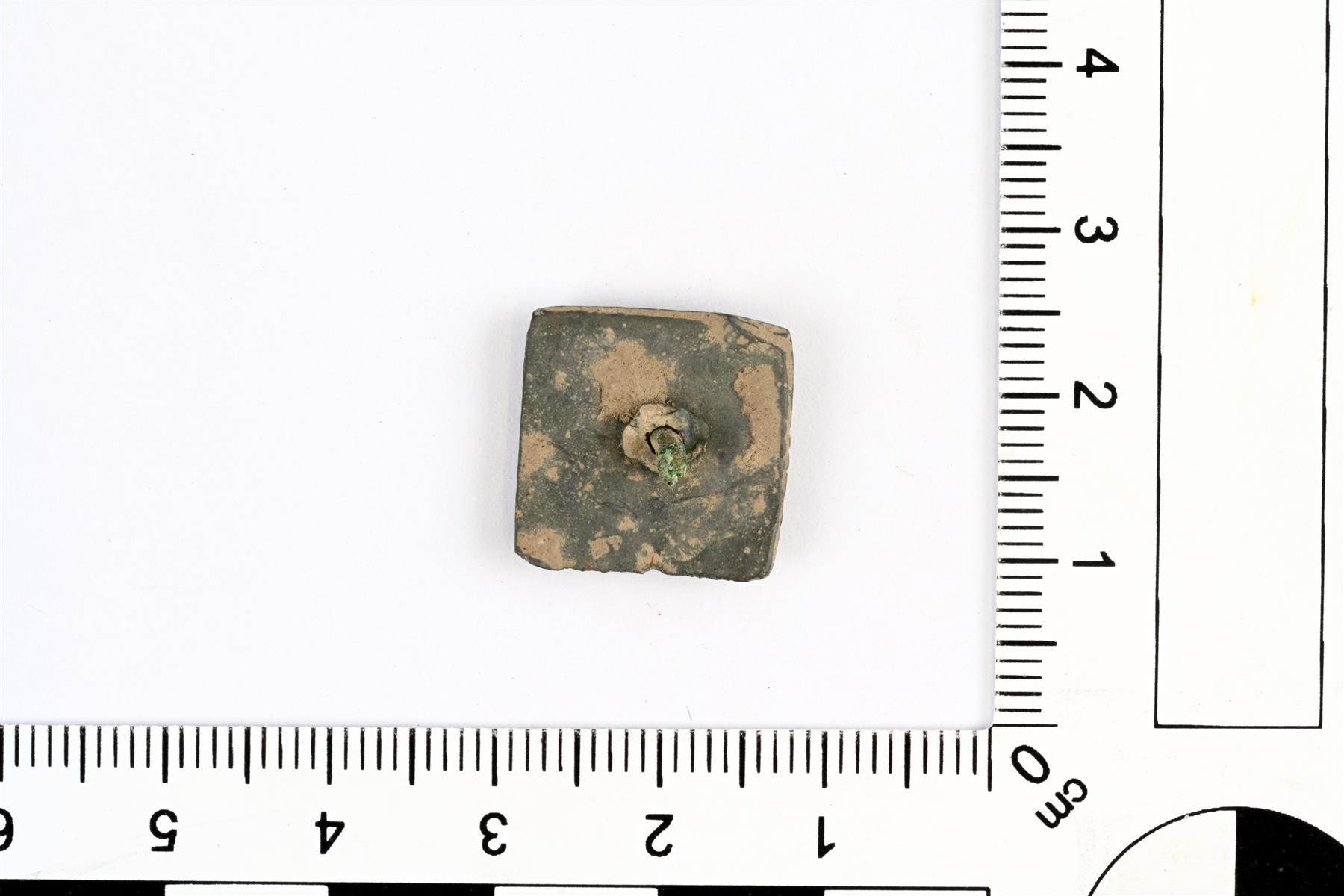 | Neliönmuotoinen vyönhela. Koristeltu kohokuvioisella vinoristillä. Vinoristin keskellä on häränsilmäleima ja reunoja kiertää viivauurre. Helan reunoja kiertää poikittaisista viivauurteista muodostuva kenttä. Taustapuolen niitti on hyvin ohut ja siinä on kiinni pieni pala aluslevystä. Vrt. Kivikoski Abb.862 ja 1124 | |
