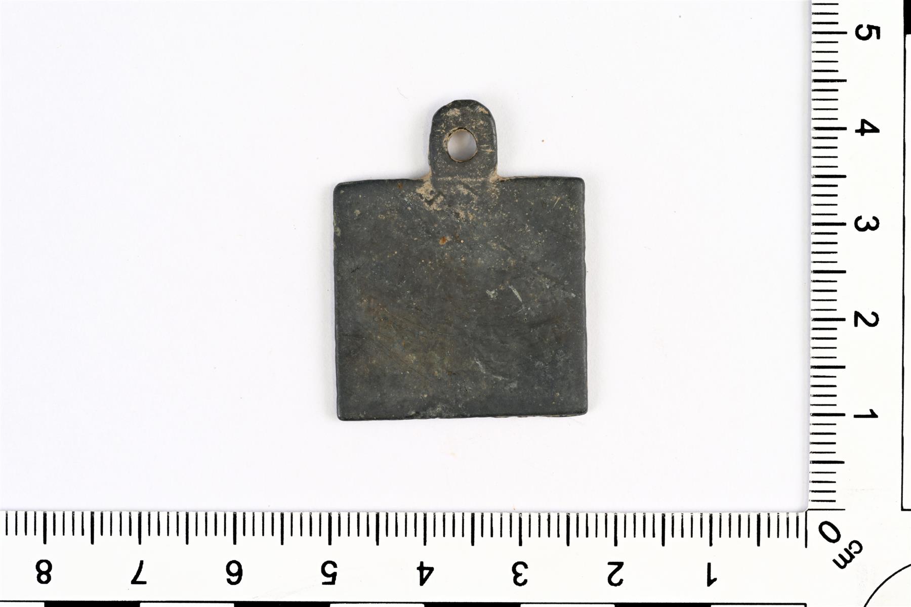 | Neliönmuotoinen matkaikoni, jonka yläreunassa on ripustuslenkki. Ikonissa on kuvattu kolme ihmishahmoa, joilla kaikilla on pyhimyskehät. Pinta on kulunut. Ei kirjoitusta. | |
