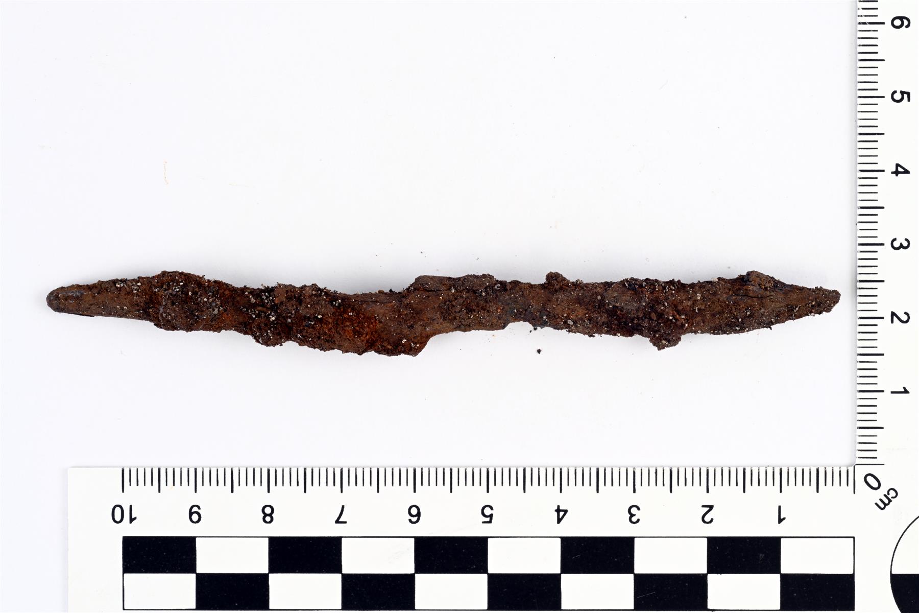 | Pienikokoinen ja alaruotoinen veitsi. Ruoto on lyhyt, joten kyseessä on todennäköisesti piiloruotoinen veitsi. Terää on teroitettu hyvin paljon ja se on kulunut melkein hamaraan saakka (suurin leveys 7,3 mm). Hamara on suora. | |