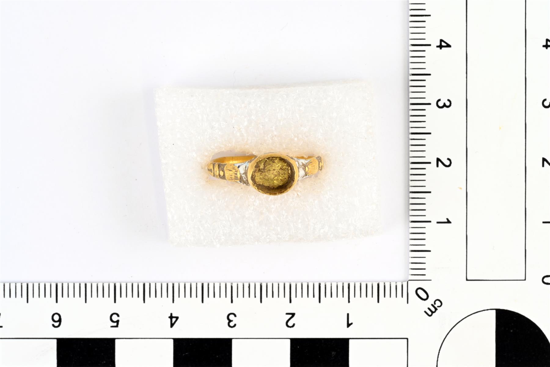 | Siro kultasormus. Kannassa on alun perin ollut kivi, mutta se puuttuu. Kantaosa on muodoltaan ovaali. Kannan sivuilla on jälkiä valkoisesta emalista. | |