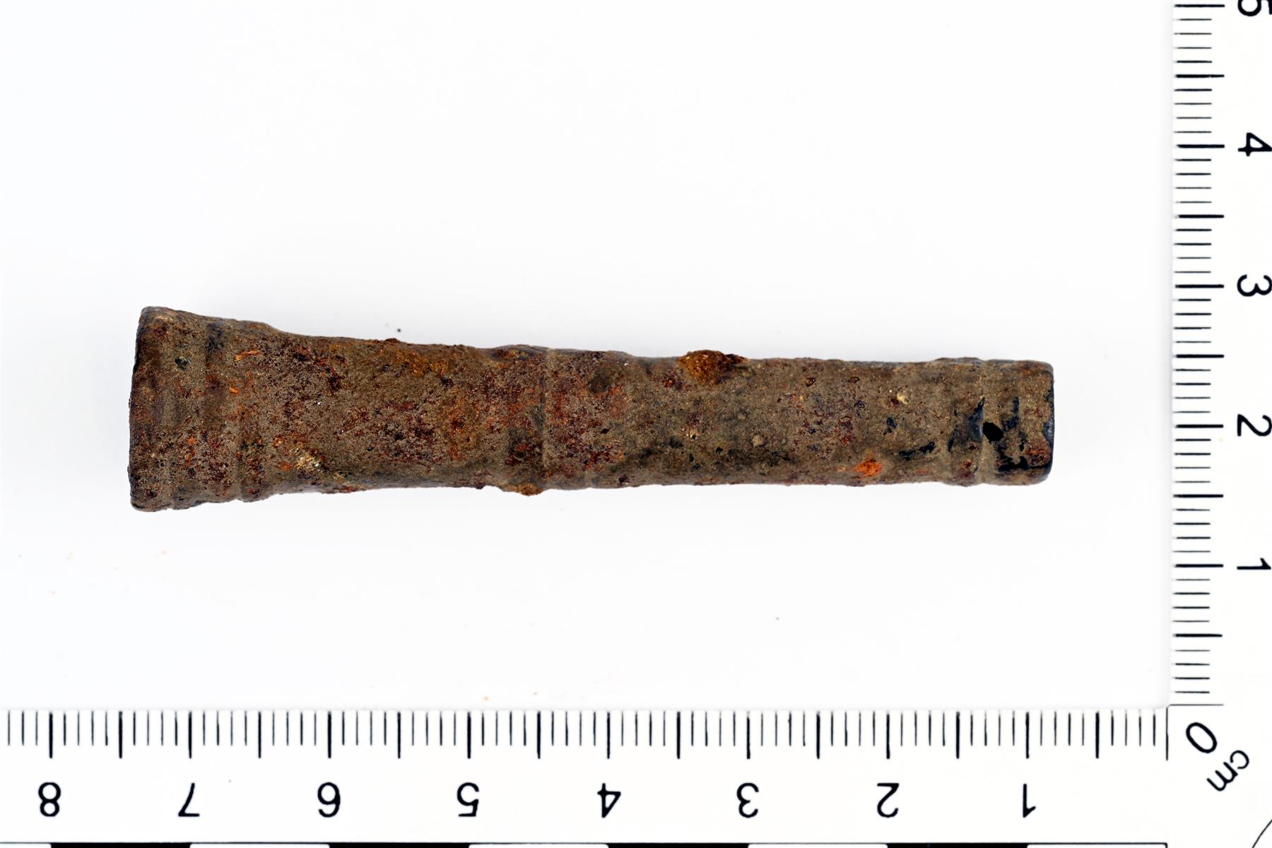 | Sylinterimäinen neulakotelo. Levenee toista päätä kohti. Molemmissa päissä ja keskellä on koristeluna rinnakkaisia kohovöitä. Sisäpuolella on mahdollisesti säilyneenä orgaanista materiaalia. | |