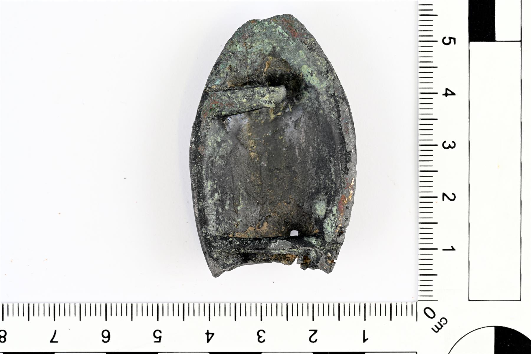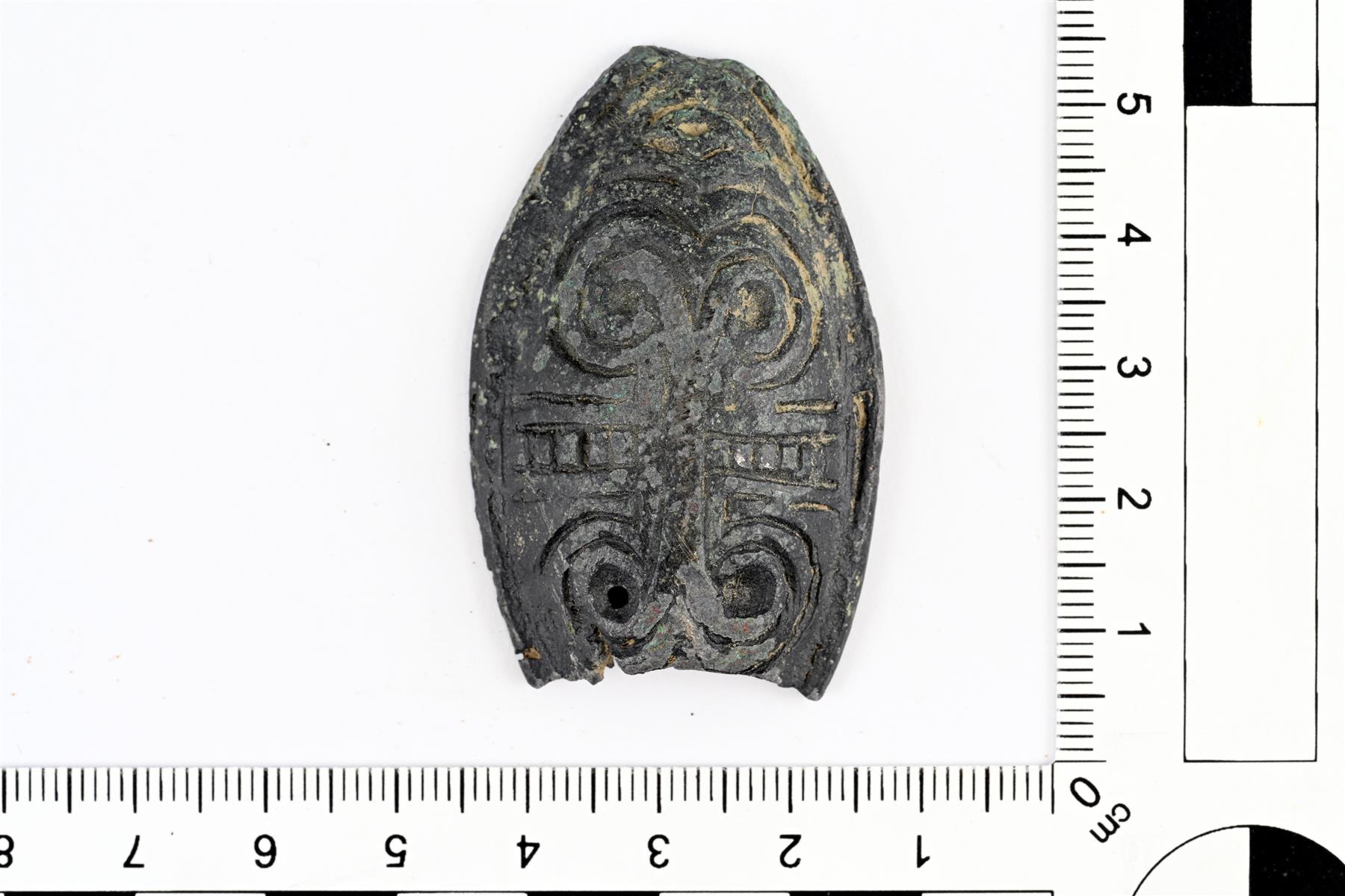 | Molemmista kapeista päistä hajonnut soikea kupurasolki. Alun perin muodoltaan teräväkärkinen soikio. Etupuolella on koristelun pääelementtinä on viivauurteella tehty kaksoisspiraalikuvio, joka toistuu molemmilla puolilla peilikuvana. Näiden välissä on poikittainen viivaurrteella tehtyjen neliöiden muodostama rivi. Paremmin säilyneessä päässä on lisäksi spiraalin muotoa noudattavia kuvioita. Taustapuoli on koverrettu ja säilyneenä on yksinkertainen neulan kiinnitystä varten tehty poikkiakseli sekä neulakota (tyyppi CC1). Koristelu muistuttaa läheisimmin Ailion G- ja I-tyypin soljissa nähtävää muotoa, mutta ei vastaa niitä täysin. | |