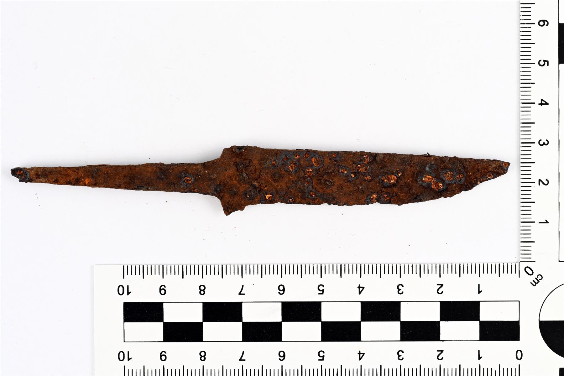 | Suorahamarainen veitsi. Alun perin todennäköisesti piiloruotoinen. Terää on teroitettu ja tyvessä on nähtävissä loivasti kovera profiili. | |