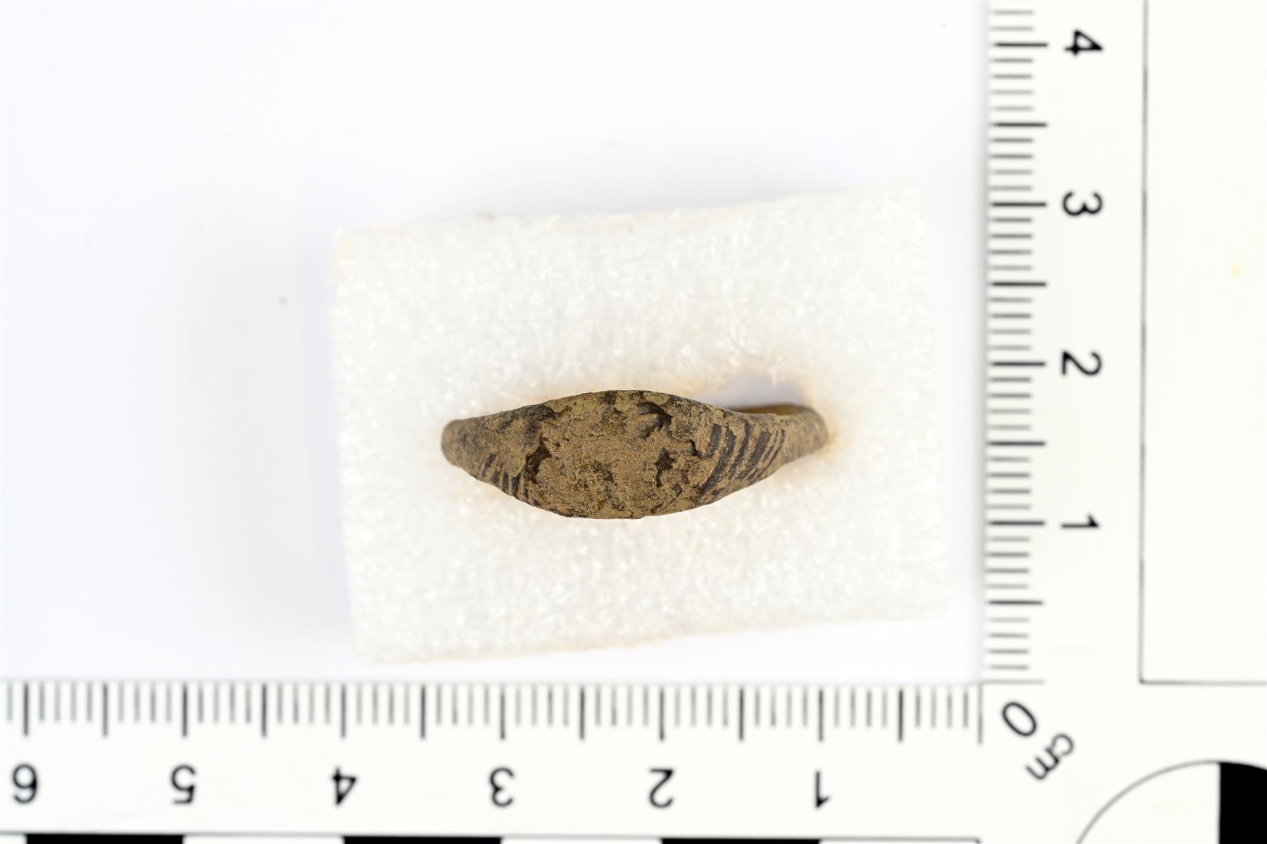 | Yksinkertainen kantasormus. Kanta on ovaali ja ja pinta on melko vaurioitunut. Kannan kummallakin sivulla on yksinkertaista vinoviivakoristelua. Sormuksen kehä on hieman vääntynyt. | |