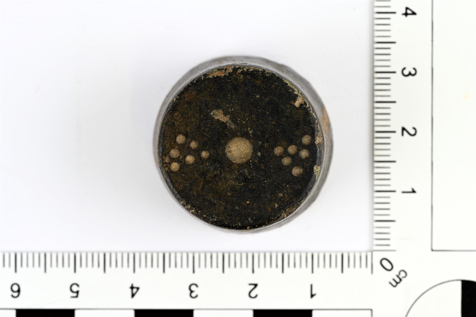 Kuppimainen punnus. Muodoltaan pyöreä ja alaspäin kapeneva punnussarjan osa. Ulkopohjassa on kahdella puolella kuudesta pistekuopasta koostuvat kolmiot. Leimoja ei havaittu. Pinnassa on sorvaamisen jättämiä uurteita. | |