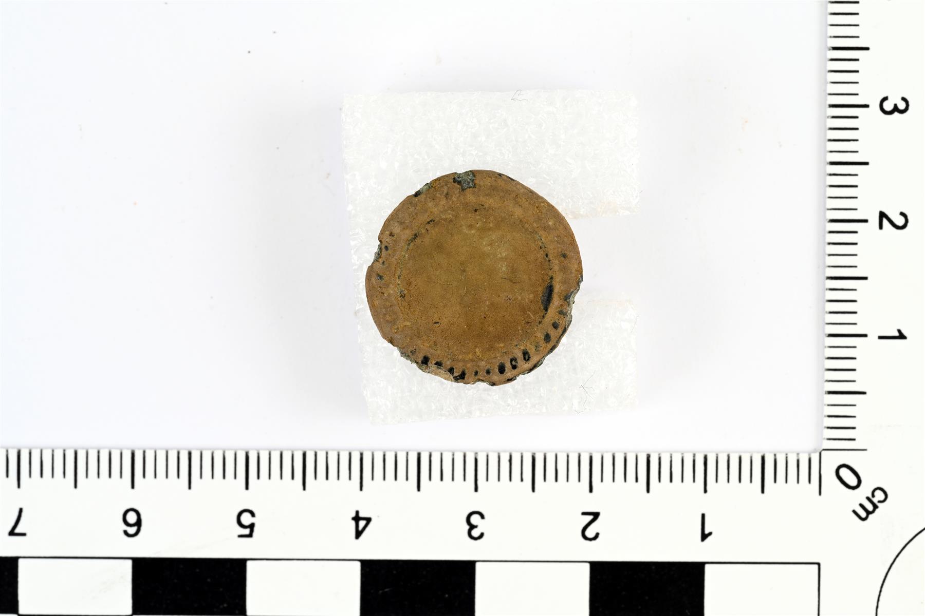 | Pyöreä nappi. Koristeluna reunaa kiertää kohoviivoja. Taustapuolen lenkki on hajonnut. | |
