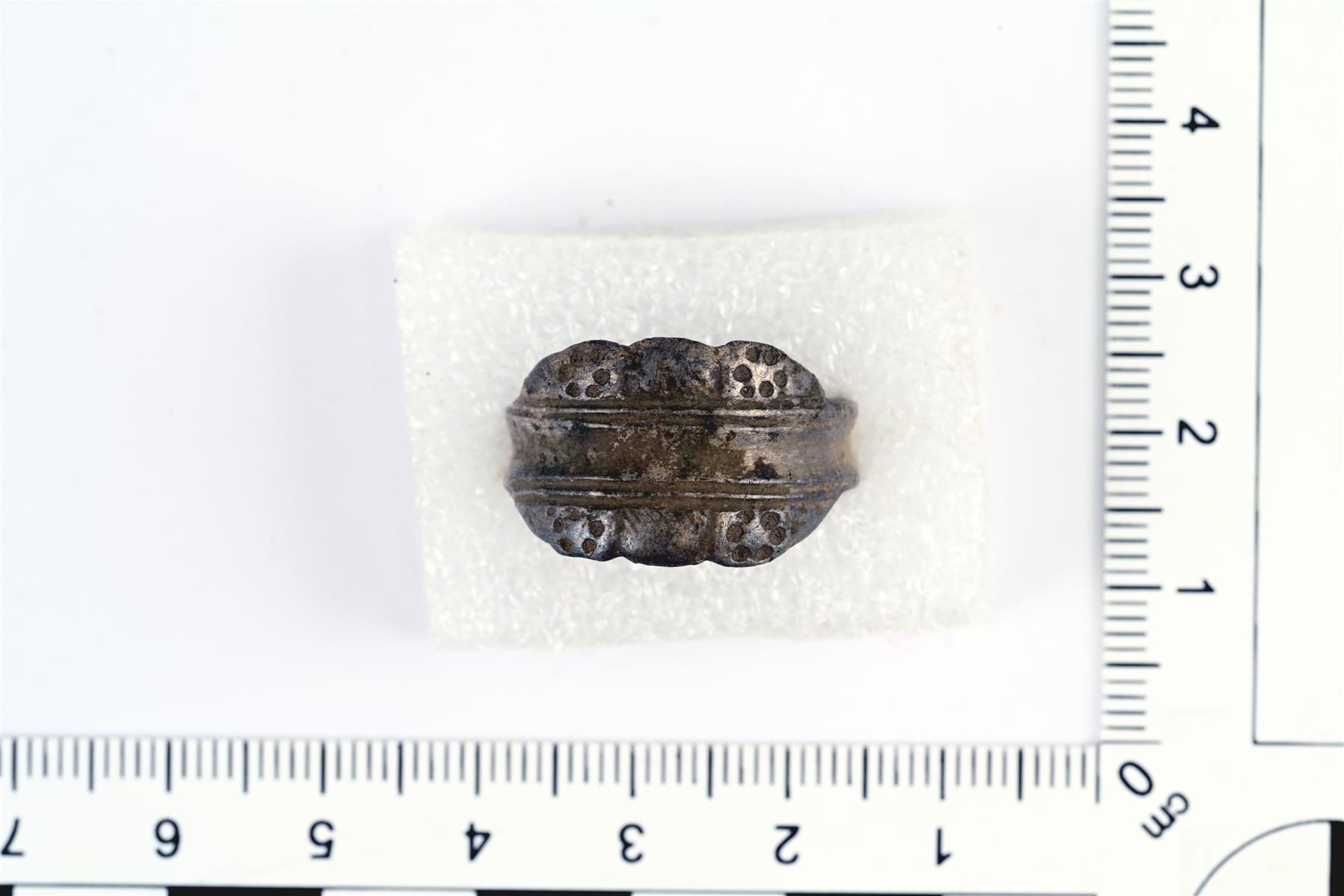 | Keskikilvellinen sormus. Kehä on umpinainen ja ulkopinnaltaan kovera. Kilpi on muodoltaan aaltoreunainen suorakaide, jossa on koristeluna ympyrään muotoon asetettuja pistekuoppia ja kehän suuntaisia viivauurteita. Ei leimoja. Vastaavanlainen sormus tunnetaan Etelä-Karjalan museon kokoelmista (Tunniste: EKME 482). | |