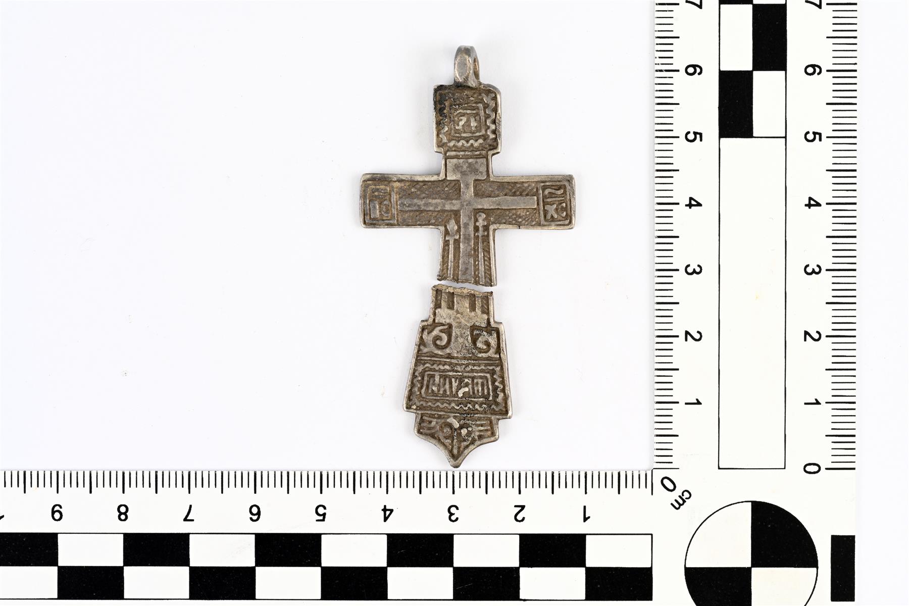 | Kahteen osaan hajonnut ortodoksinen kasteristi. Jussi Moisio 31.3.2023 KM44728:2_1_ristiriipus |