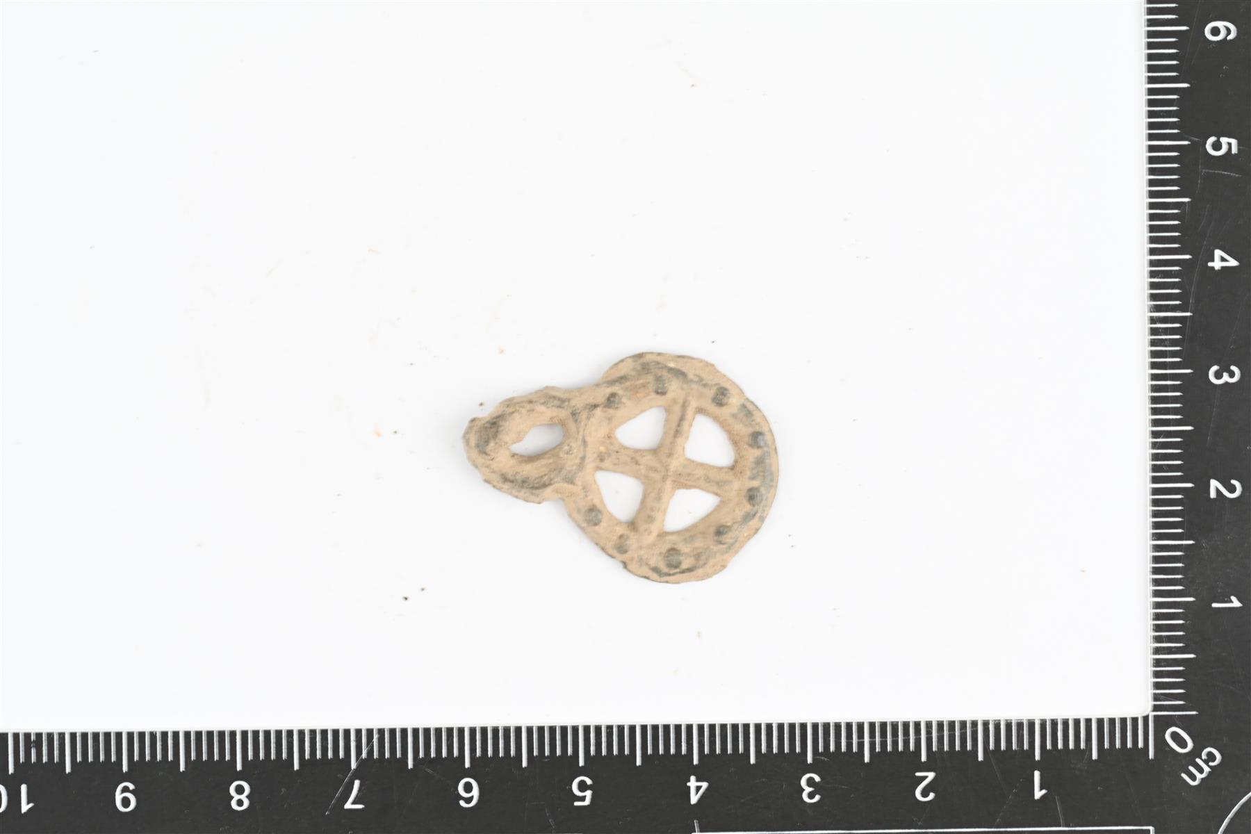 Vaatteenhakanen, ilmeisesti tinaseosta. Pyöreä pienillä tapeilla koristeltu kehä, jonka keskellä tasavartinen ristikuvio. Kehässä kiinni soikeahko rengas vastinparin koukkua varten. | |