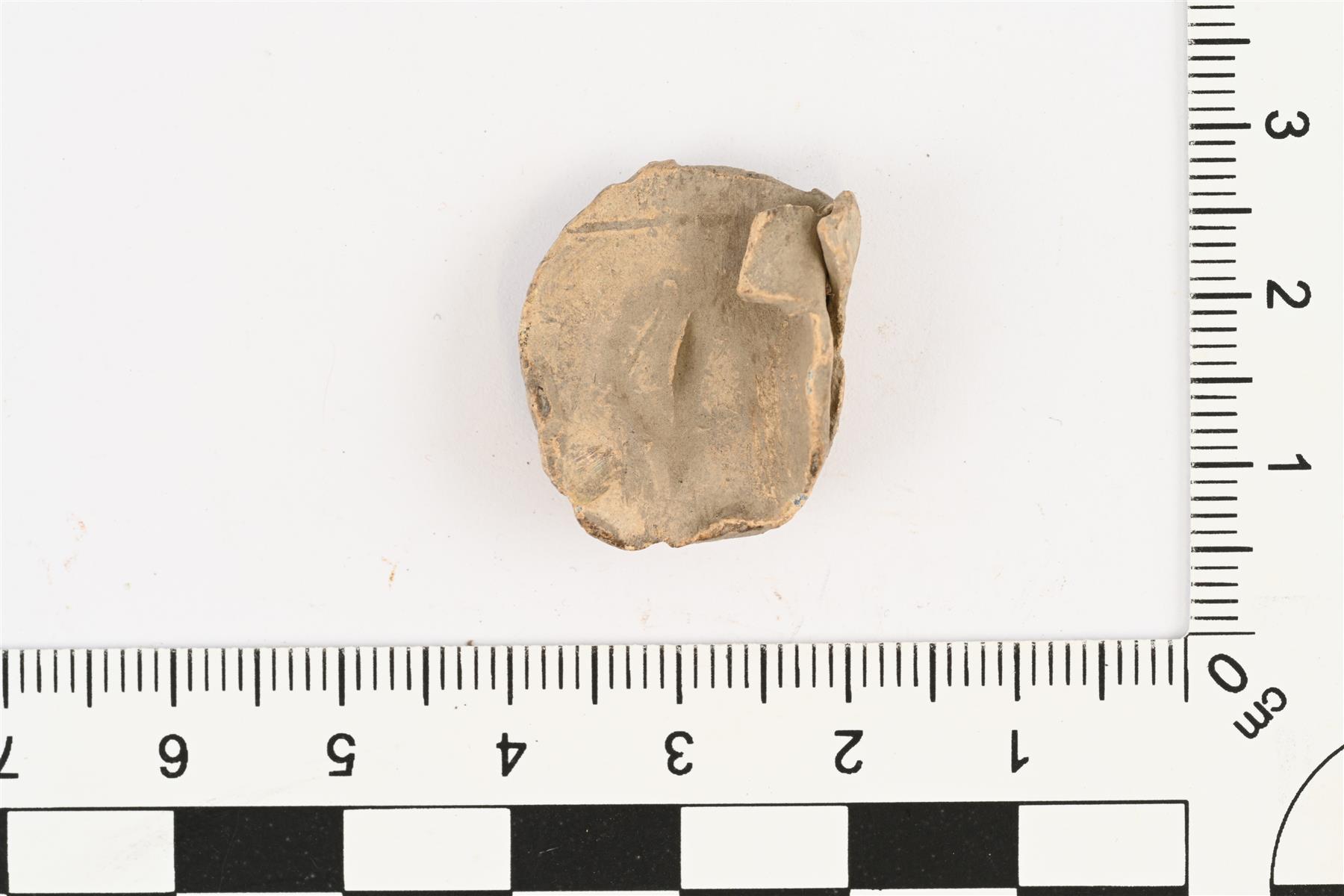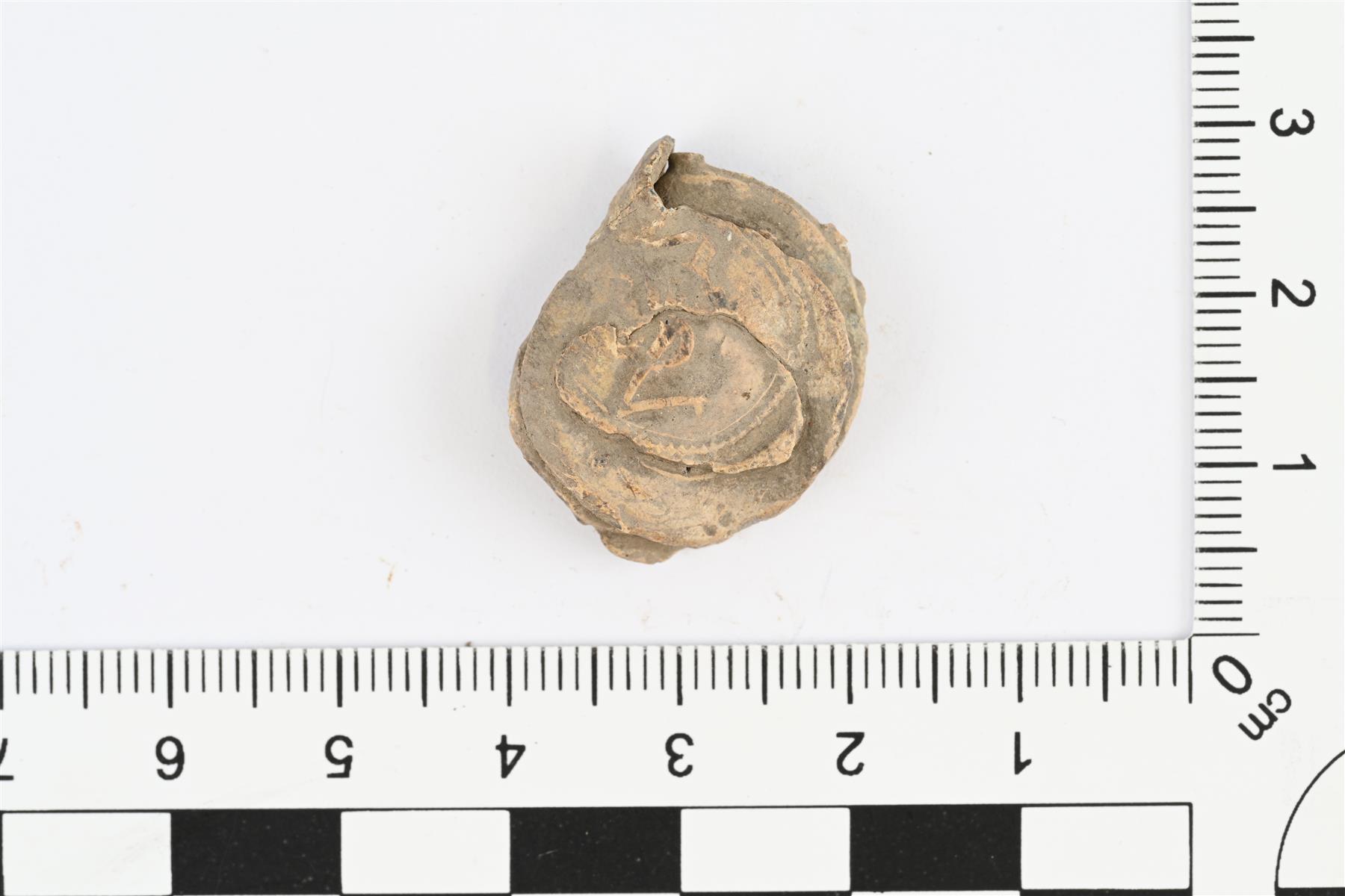 | Lyijyplombi. Kaksi toisiinsa kiinnittyvää puoliskoa, joita on yhdestä reunasta yhdistänyt kapea, nyt katkennut lyijysuikale. Toisella puolella epäselviä kuvioita, mahdollisesti numeroita tai puumerkkimäinen kuvio. | |