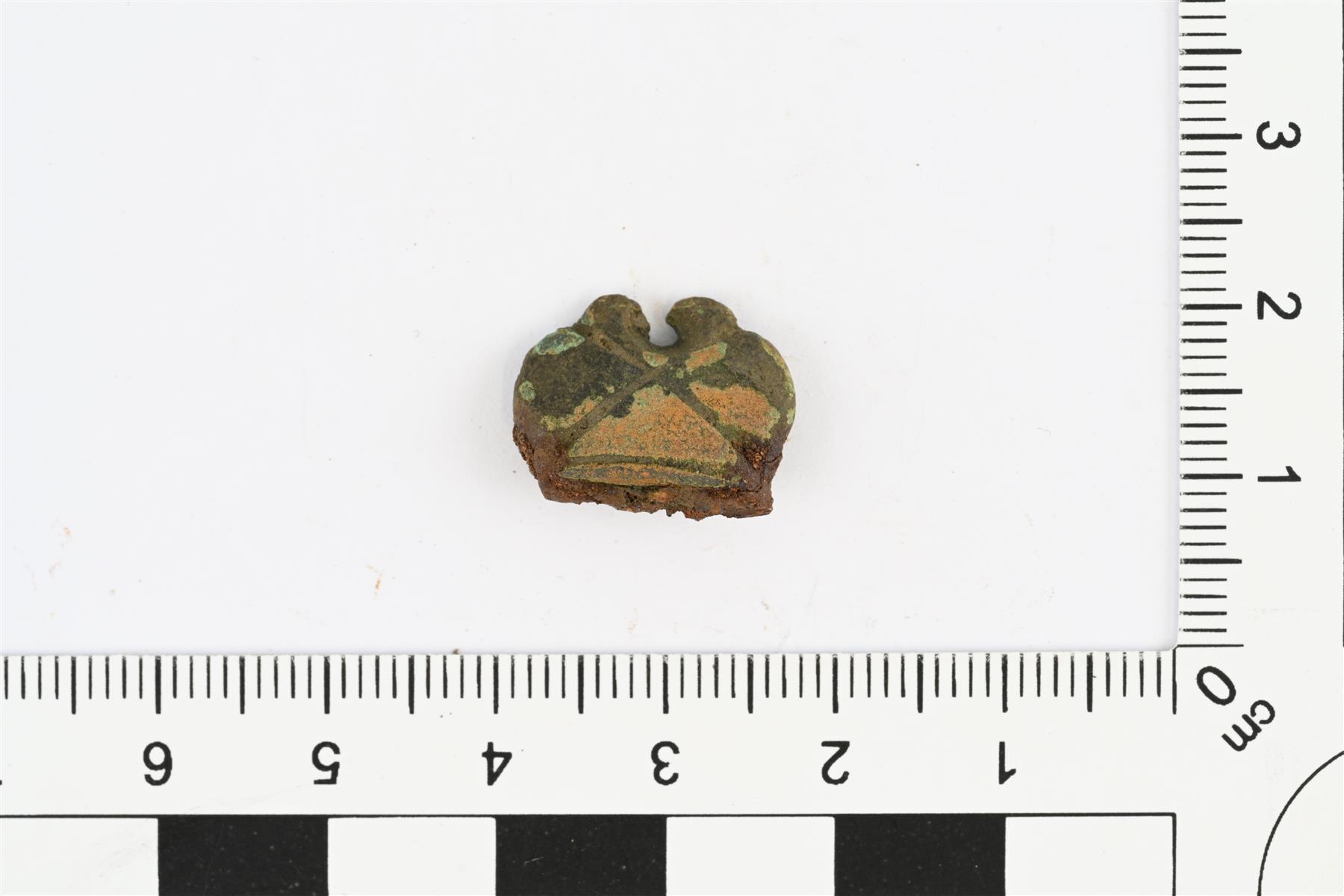 | Pöytäveitsen ylähela, kupariseosta. Litteähkö, yläreunaa kohti litistyvä. Sivusta katsoen soikeahko, kaarevan yläreunan keskellä katkennut uloke, jossa pyöreä reikä. Sivuihin uurrettu vinoristi. Leveä ja litteä veitsen kahvaruoto jatkuu ylähelan sisään. | |