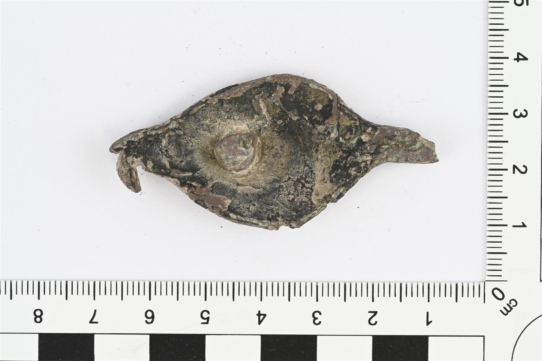 | Padankorvakkeen katkelma, kupariseosta. Korvakkeen lehdenmuotoinen pää, jonka keskellä niitti. | |