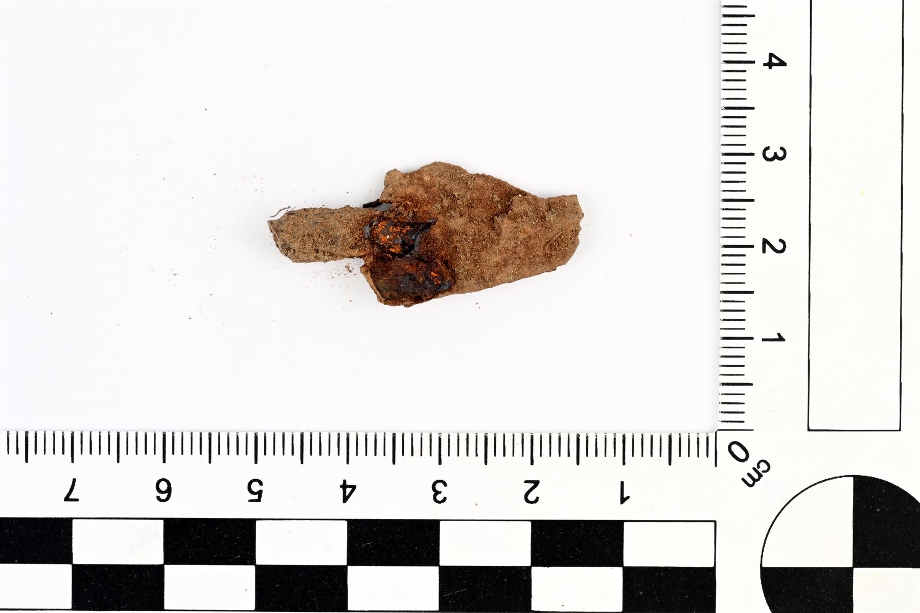 | Kaksi katkelmaa ruodollisesta nuolenkärjestä. Kaksiteräinen ja alun perin tyviosan molemmilla puolilla on ollut väkäset. Ruodosta on jäljellä pieni pala. Kärjestä on tallella irrallinen pala. | |