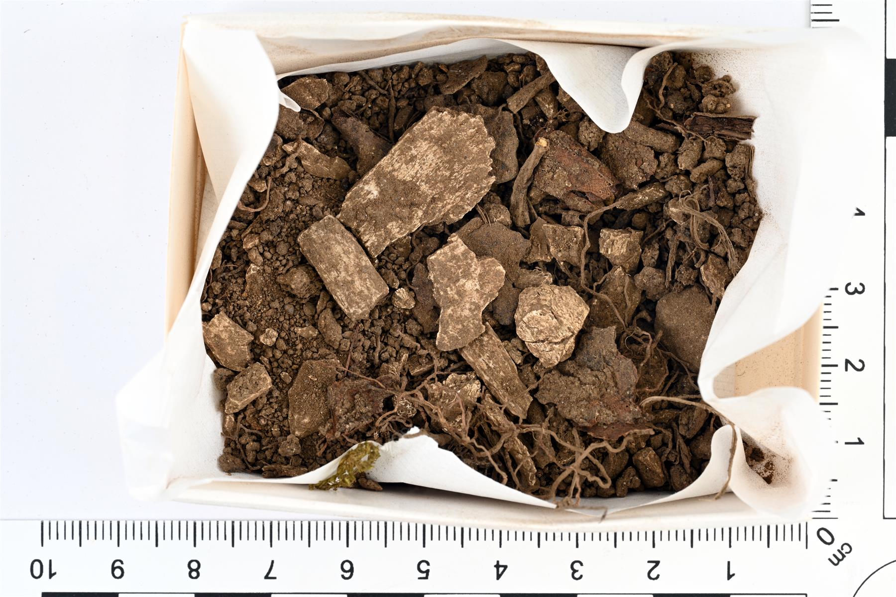 | Maanäyte, jonka joukossa on palaneita luita. Näistä voi tunnistaa muutamia putkiluiden ja kallon palasia. Luut ovat palaneet korkeassa lämmössä ja ne ovat väriltään valkoisia. Luut ovat todennäköisimmin peräisin ihmisestä, mutta tarkempaa tietoa iästä, sukupuolesta, sairauksista tai pituudesta ei voi saada. Suurin pala on n. 22,5 mm. | |