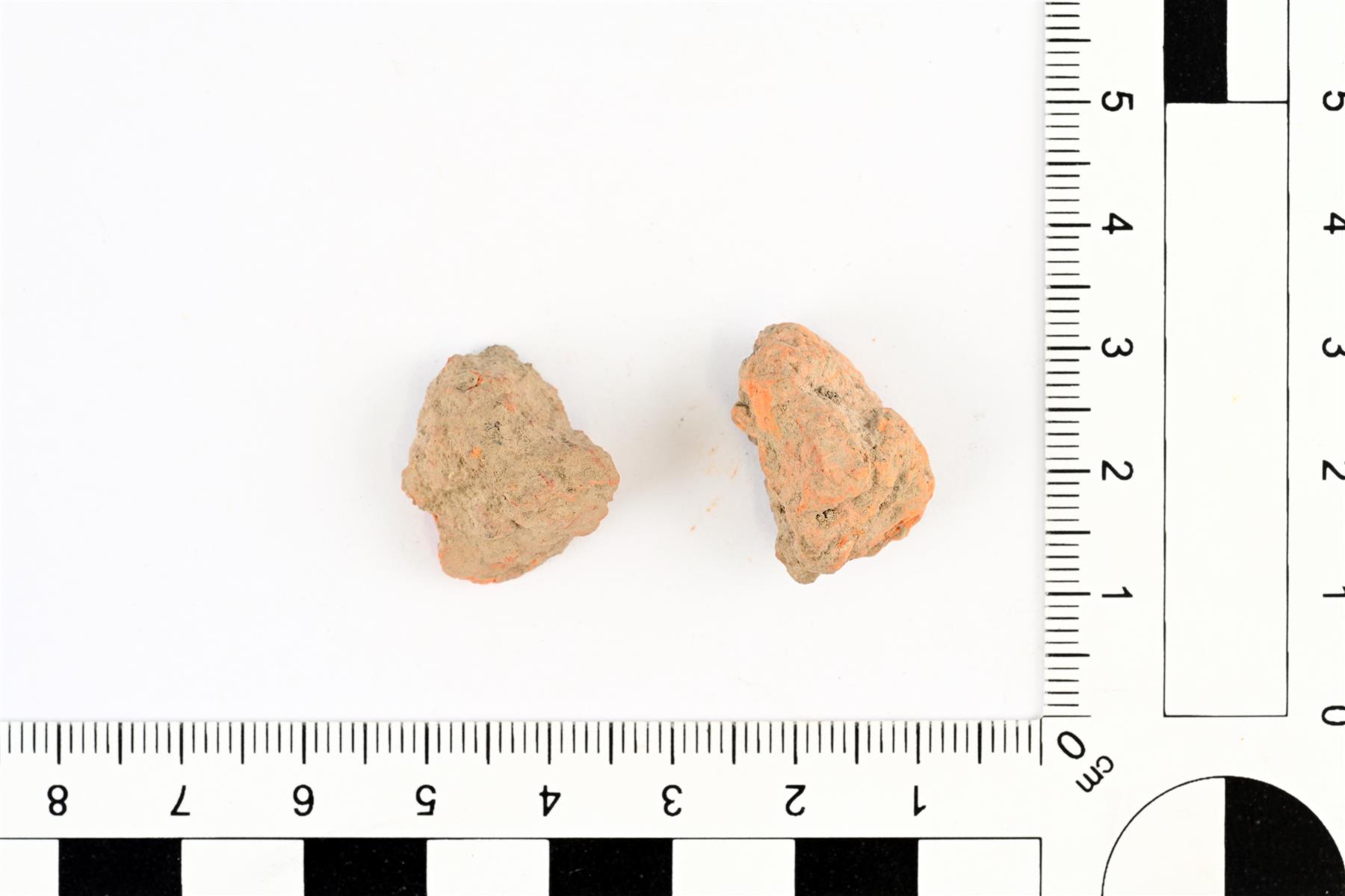 | Kaksi pientä savitiivisteen palaa. Väriltään punertavan oranssi. Ei oksapainanteita tai merkkejä kuonaantumisesta. | |