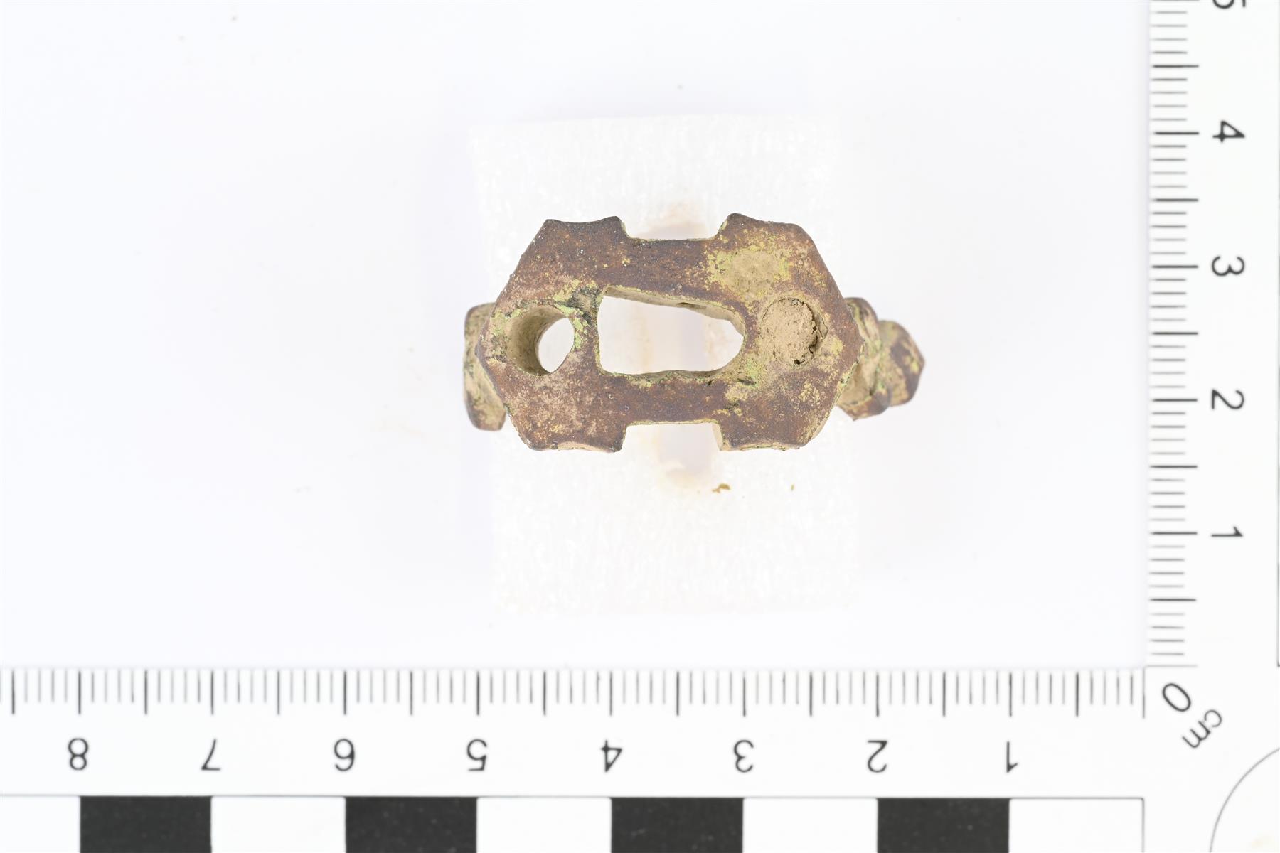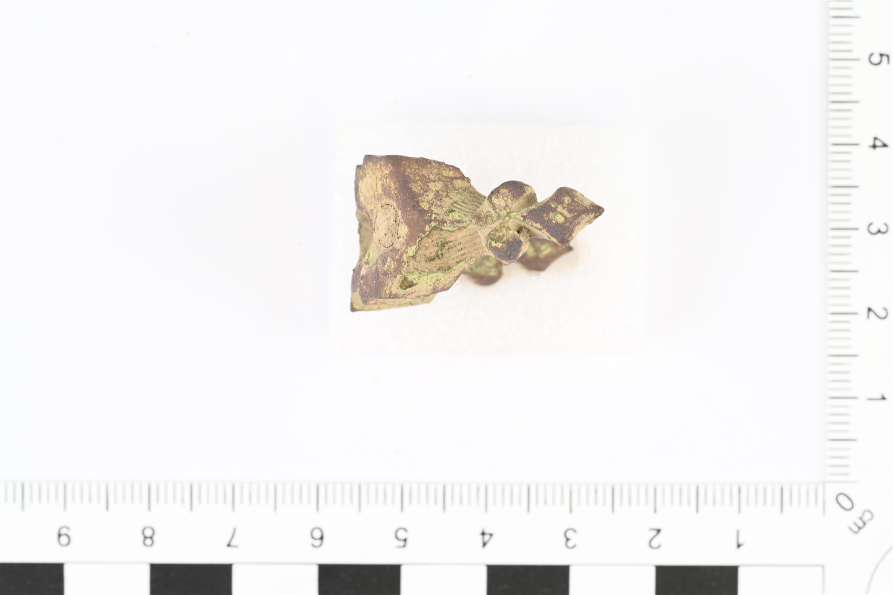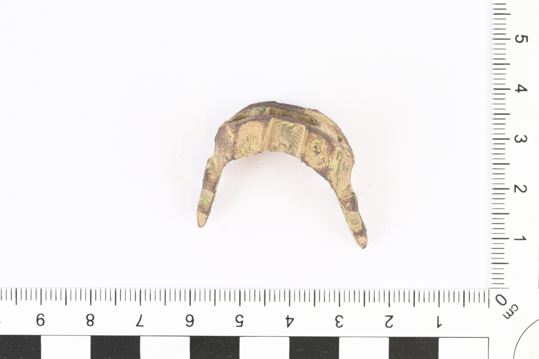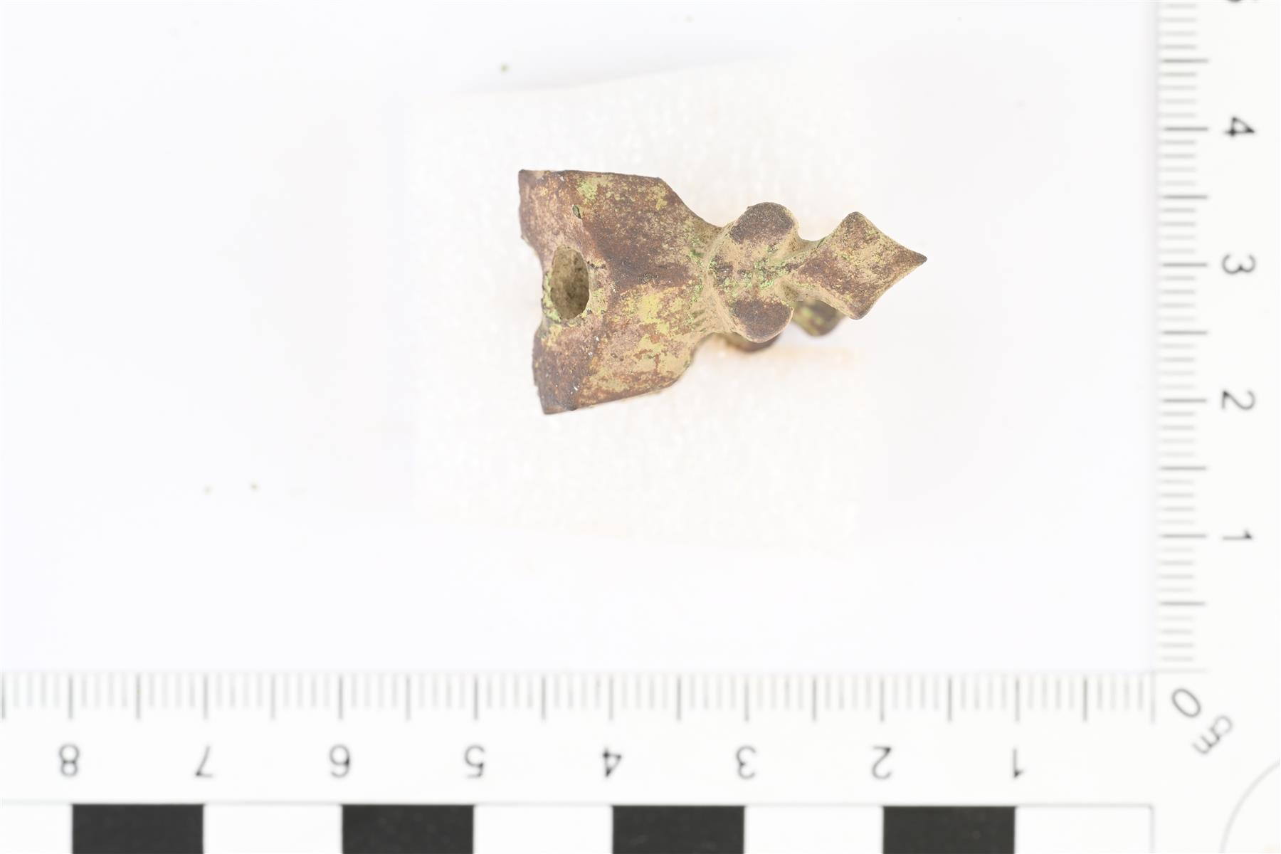 | Mahdollinen veitsen päätehela. U-kirjaimen muotoinen. Keskiosa paksumpi ja siinä kolme reikää, joista keskimmäinen pitkänomainen ja sen molemmin puolin pyöreät reiät. Keskiosan päistä taipuu kapeammat ja ohuemmat, koristeelliset varret. | |