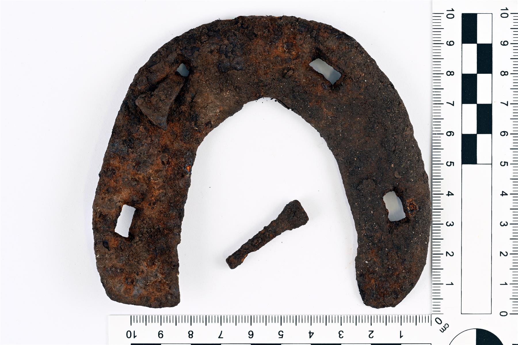 | Hyvin säilynyt hevosenkenkä. Kaari on melko leveä ja sen kummallakin sivulla on kaksi suorakaiteenmuotoista reikää. Yhdessä reiässä on naula kiinni. Kaaren päät ovat suorat. Lisäksi mukana on yksi irtonainen naula. | |
