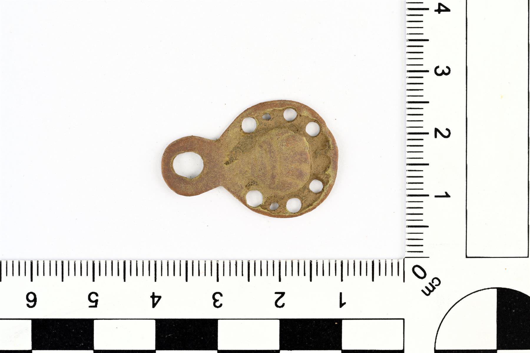 | Pyöreä vaatehakasen puolikas. Keskiosassa on koristeena kruunumainen kohokuvio. Ylä- ja alareunassa on molemmissa kolme suurempaa reikää ja yksi pienempi. Reunassa on pyöreä lenkki. | |