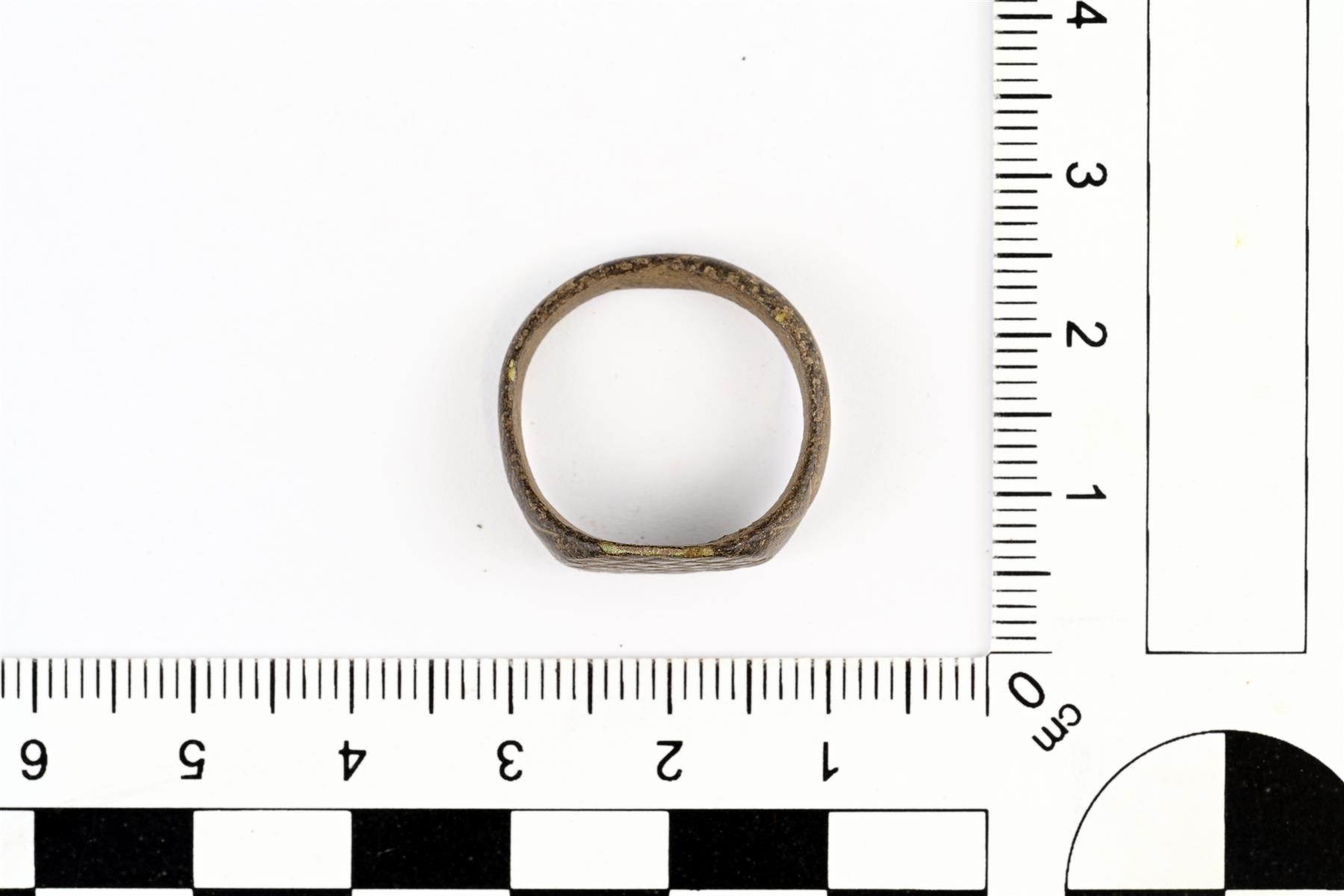 | Hyvin säilynyt Sarvas-sormus. Kanta on muodoltaan ovaali. Kannan koristeluna on viivauurteilla tehty ristikko- tai shakkiruutukuvio. Kannan kummallakin puolella on koristeena viivauurteella tehdyt X-kuviot. | |