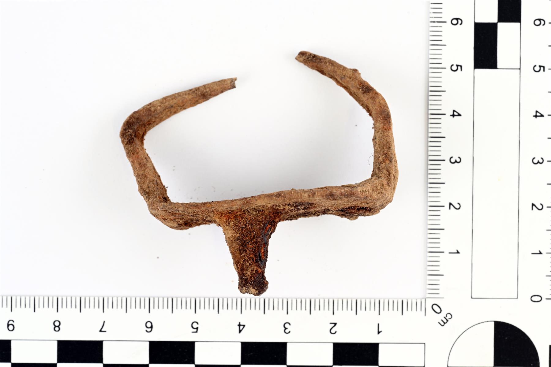 | Kaksipiikkinen viskari. Pohjalevy on muodoltaan ovaali. Nasta on pitkänomainen piikki. Molemmat kiinnitysnaulat on taitettu. | |