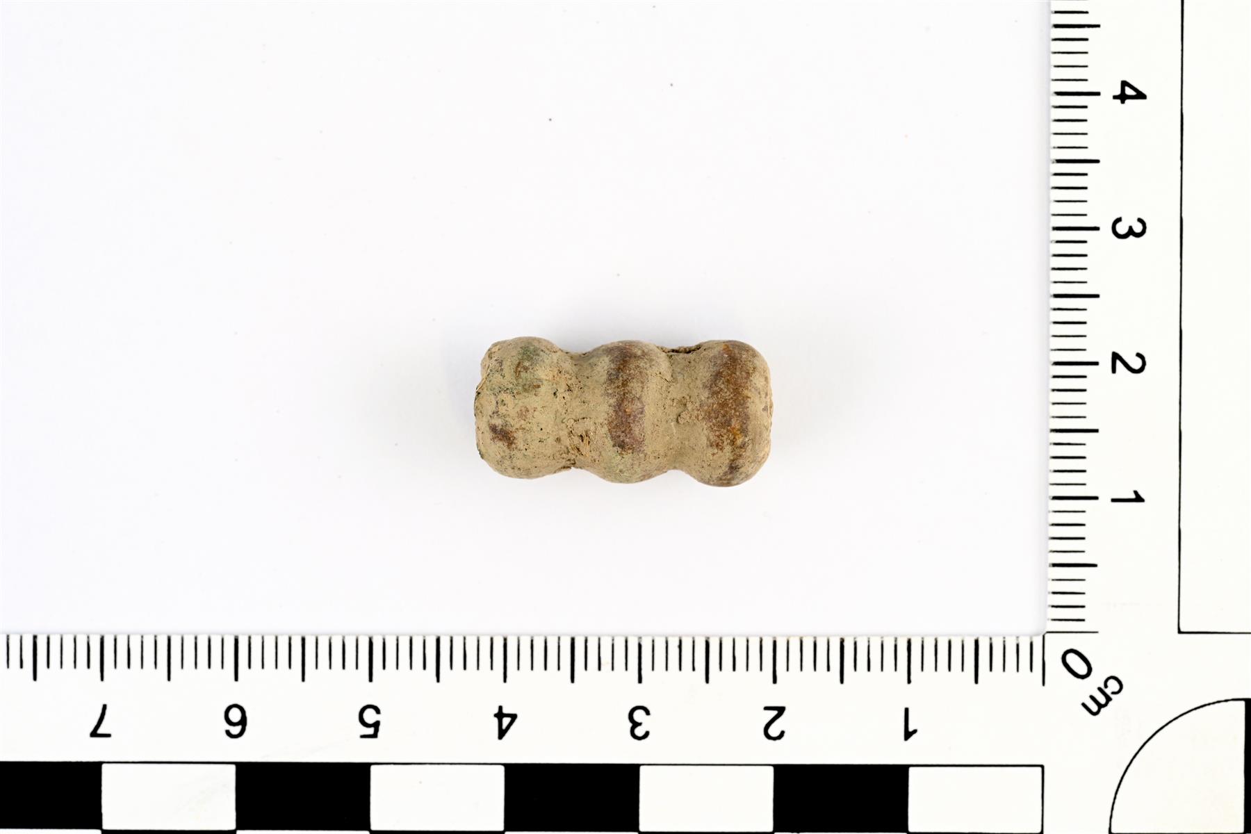 | Kolmiosainen sarjahelmi. Helmet ovat muodoltaan sivuilta litistyneen pyöreitä. Läpi menevä reikä on melko keskellä helmeä. | |
