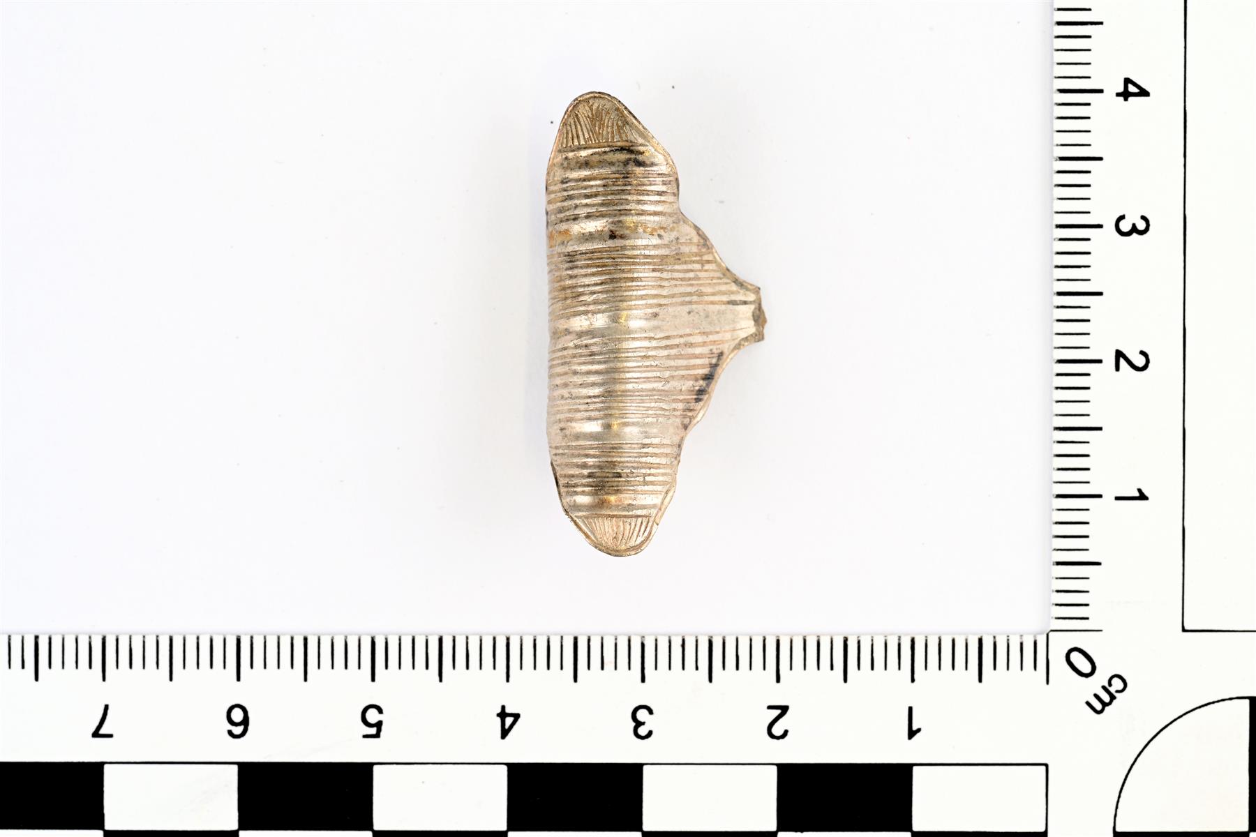 | Ompelusormuksen kilven katkelma. Tehty ohuesta hopeapellistä. Kilpi on päihin kapeneva ovaali. Koristeluna on poikittaisia viivauurteita ja päissä on pystyviivoitusta. Viivauurteet on tehty kaivertamalla ja työn jälki on melko karkeaa. | |