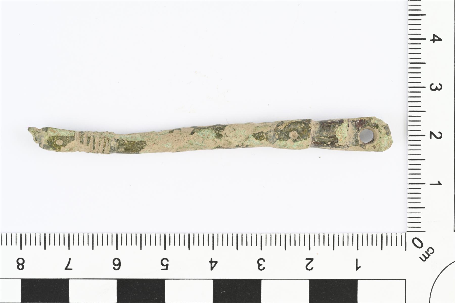 | Vaaan nivelvarsi. Toiseen päähän hieman oheneva, muotoiltu ja profiloitu puikko. Paksummassa päässä litteä lenkki ja sen alapuolella poikkileikkaukseltaan nelikulmainen osa, jossa joka sivulla pisteleima. Kapeammassa päässä myös nelikulmainen osa, jossa pisteleimat joka sivulla, sekä vaakauria. Koristeltujen päiden välissä poikkileikkaus pyöreä. Kapeampi pää katkennut. | |