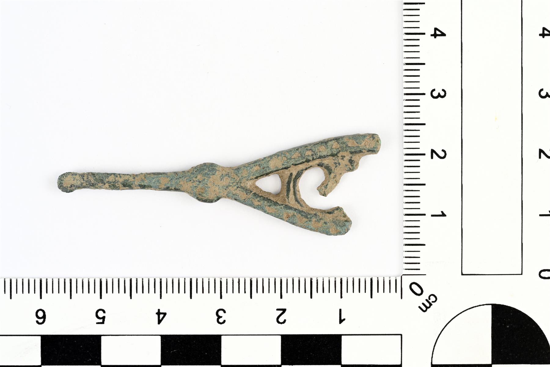 | Korvalusikan alaosan katkelma. Säilynyt keskiosa on muodoltaan ovaali ja siinä on puhkonaista koristelua sekä kasviornamentiikkaa. Reunoja kiertää pisteviivojen muodostama rivi. Lusikan varren yläosassa on paksunnos ja loppuosa on kapea. Vrt. Kivikoski Abb. 1136. | |