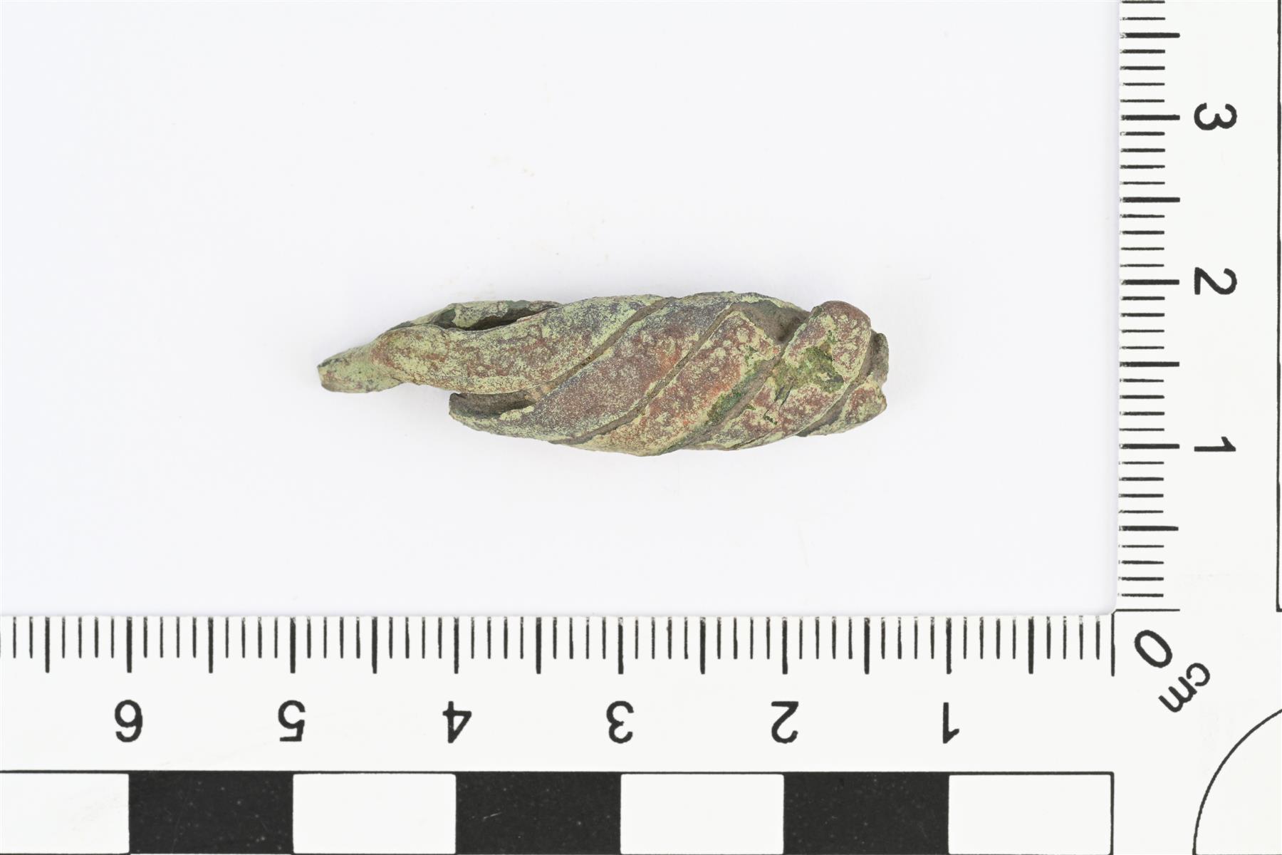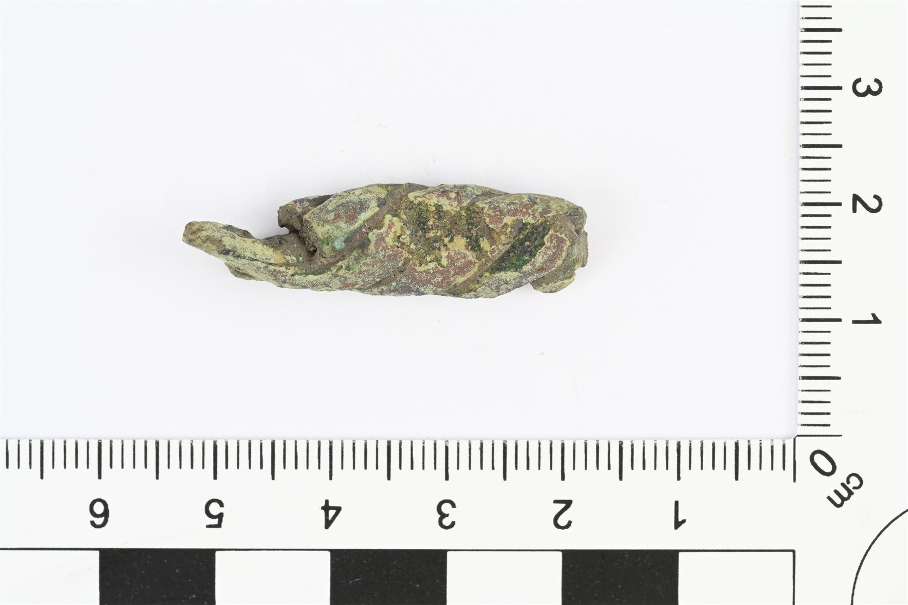 | Kaularenkaan katkelma. Kierretty neljästä vartaasta, joiden poikkileikkaus soikea tai pyöreä. Molemmat päät katkenneet. Katkelma on litistynyt. | |