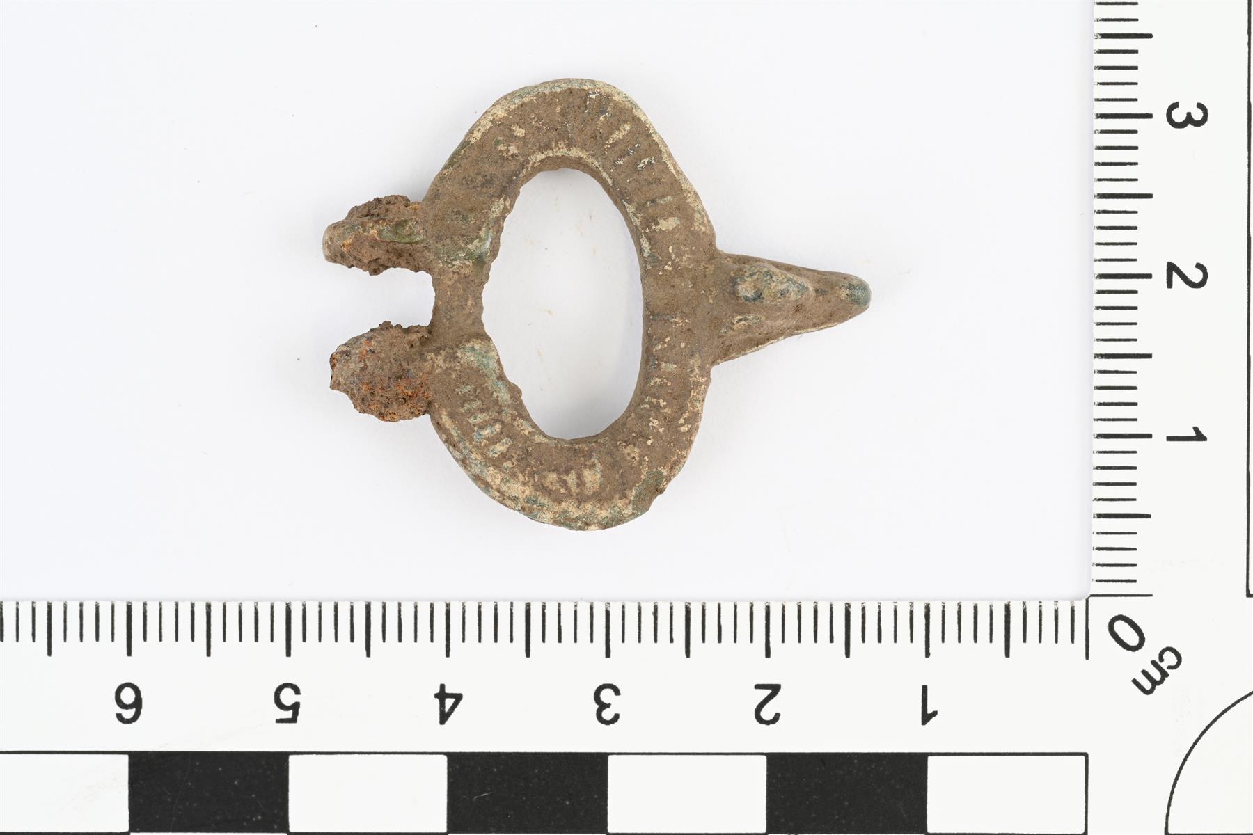 | Vyönsoljen kehä. Soikea kehä, jonka toisella pitkällä sivulla melko pitkä kolmiomainen uloke kohdassa, johon kielen kärki asettuisi. Soljen etupuolella ulokkeessa pyöreä litteä kohouma. Kehän vastakkaisella sivulla kavennus kielen tyveä varten ja sen molemmin puolin pienet litteät pyöreäpäiset ulokkeet. Näissä ulokkeissa kiinni hieman korrodoitunutta rautaa. Toisen ulokkeen toisella pinnalla erottuu pieni reikä. Mahdollisesti ulokkeiden reikien kautta kulkenut ohut rautainen akseli. Kehän etupuolella tiheää viivakoristelua. Kehän muoto samanlainen kuin soljessa Kivikoski 1973, Taf. 137, Abb. 1197. Löytyi samasta kohdasta kuin vyönhela KM 44793:2. | |