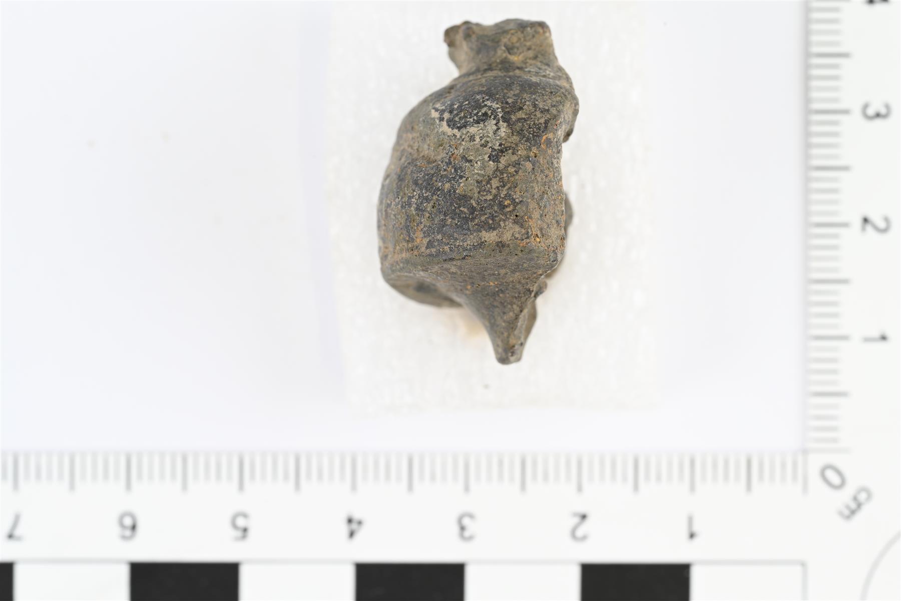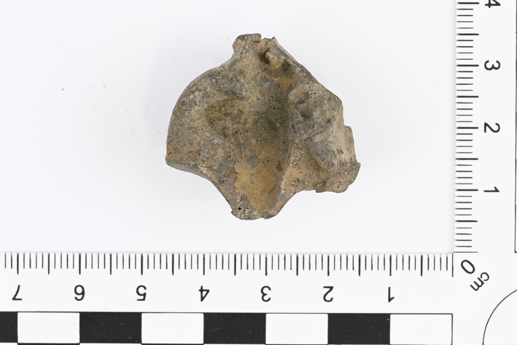 | Jykevän valetun kupariseosesineen katkelma. Mahdollisesti uuden ajan miekanponnen katkelma. Puolikas poikkileikkaukseltaan pyöreästä, sivusta katsoen voimakkaasti profiloidusta esineestä. Esineen sisällä kulkee ontto pitkittäinen kanava. Pinnassa mahdollisesti koristelua. | |