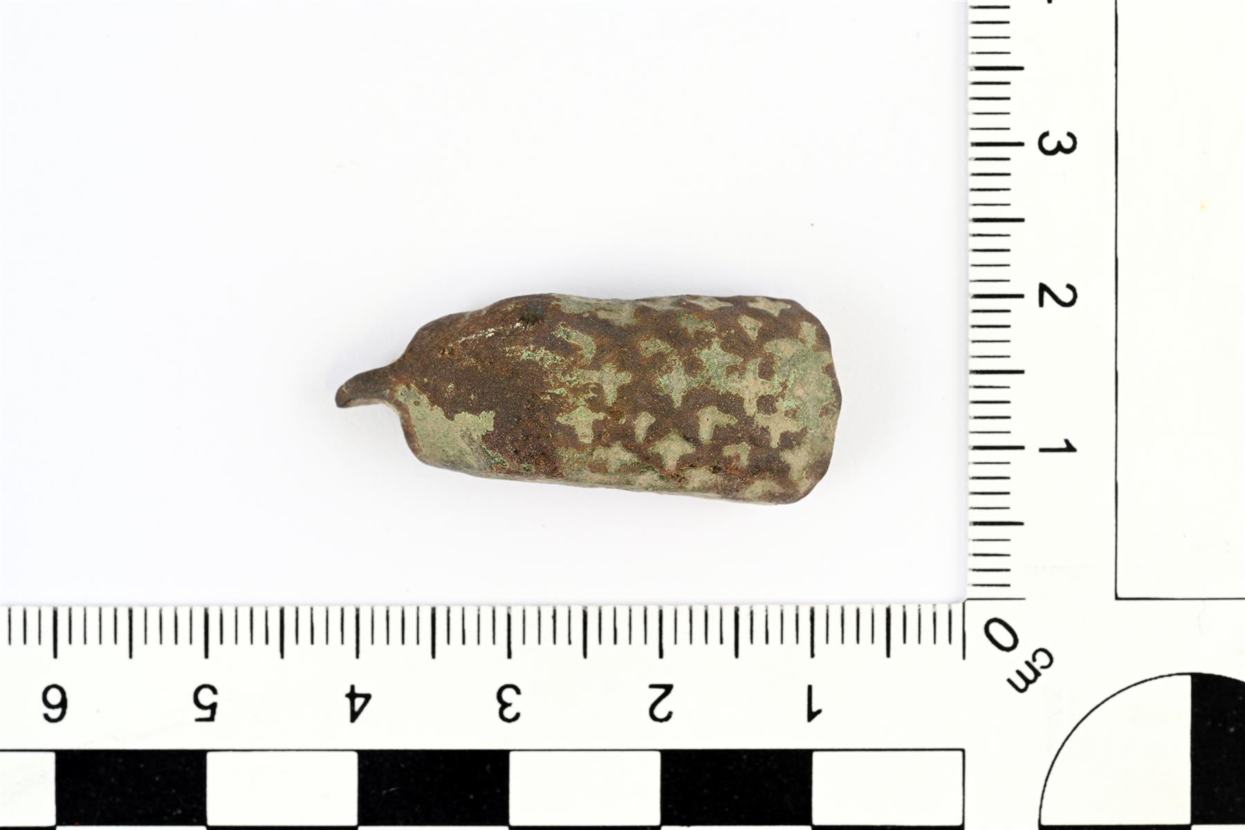 | Saranoidun rannerenkaan päätysegmentti. Poikkileikkaukseltaan ulkopinnasta kupera ja taustapuolelta tasainen. Ulkopääty on suora ja vastakkaisessa päädyssä on kapea levy, joka on toiminut saranan osana. Ulkopinnassa on plusmerkin muotoisten kaiverrettujen kuvioiden muodostama kenttä. Samantapainen kuin Jokipelto 2:sta aikaisemmin luetteloitu rannerenkaan keskisegmentti (KM 43859: 3). Vrt. Kivikoski Abb. 436. | |