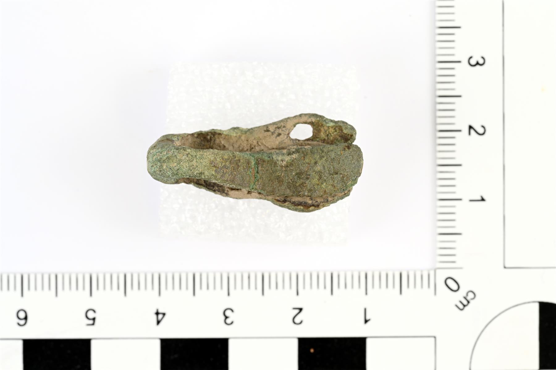 | Eläinpäinen hihnanjakajan hela. Taustapuolen levy on painettu etupuolta vasten. Sivuilla on puhkonaiset koristekuviot. Koristelu noudattaa vastaavien helojen muotoa ja eläin on kuvattu tyylitellysti. Vrt. Kivikoski Abb. 834. | |