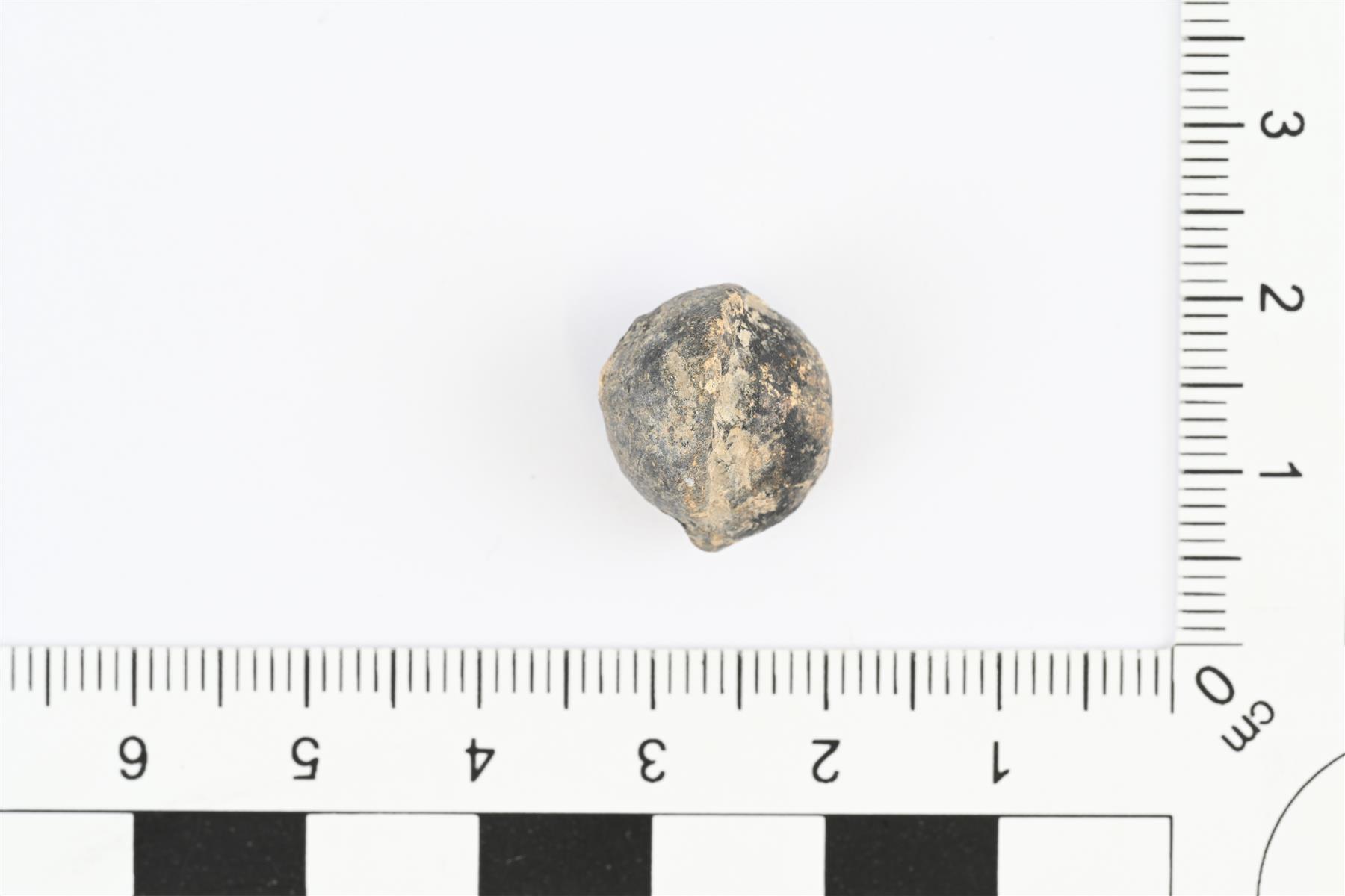 | Valussa epäonnistunut musketinkuula. Valumuotin puoliskot eivät ole olleet kohdakkain, minkä seurauksena kuulassa on kaksi puolipalloa osittain kohdakkain. Yksi reuna tasainen, mahdollisesti jälkeenpäin muotoiltu. | |