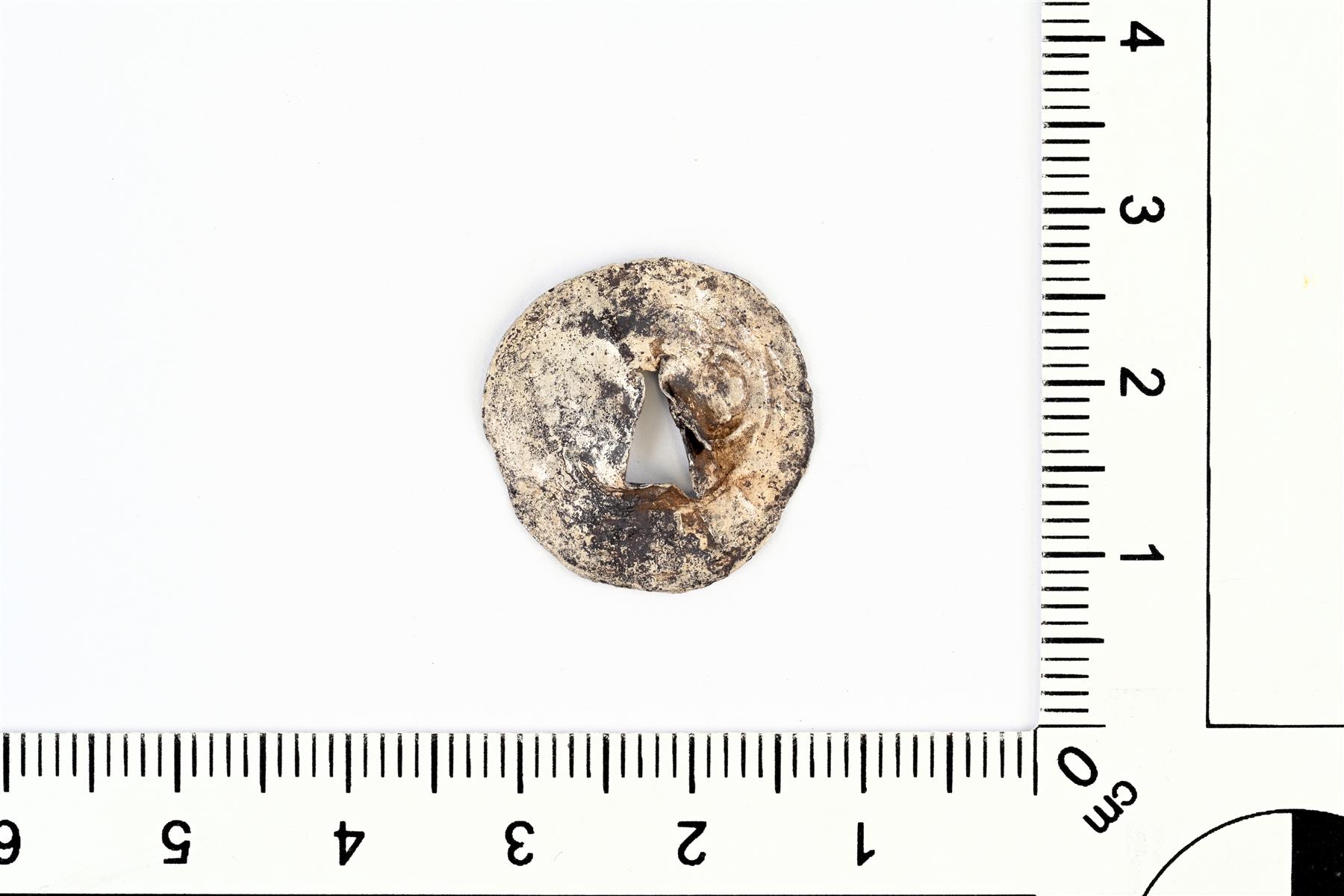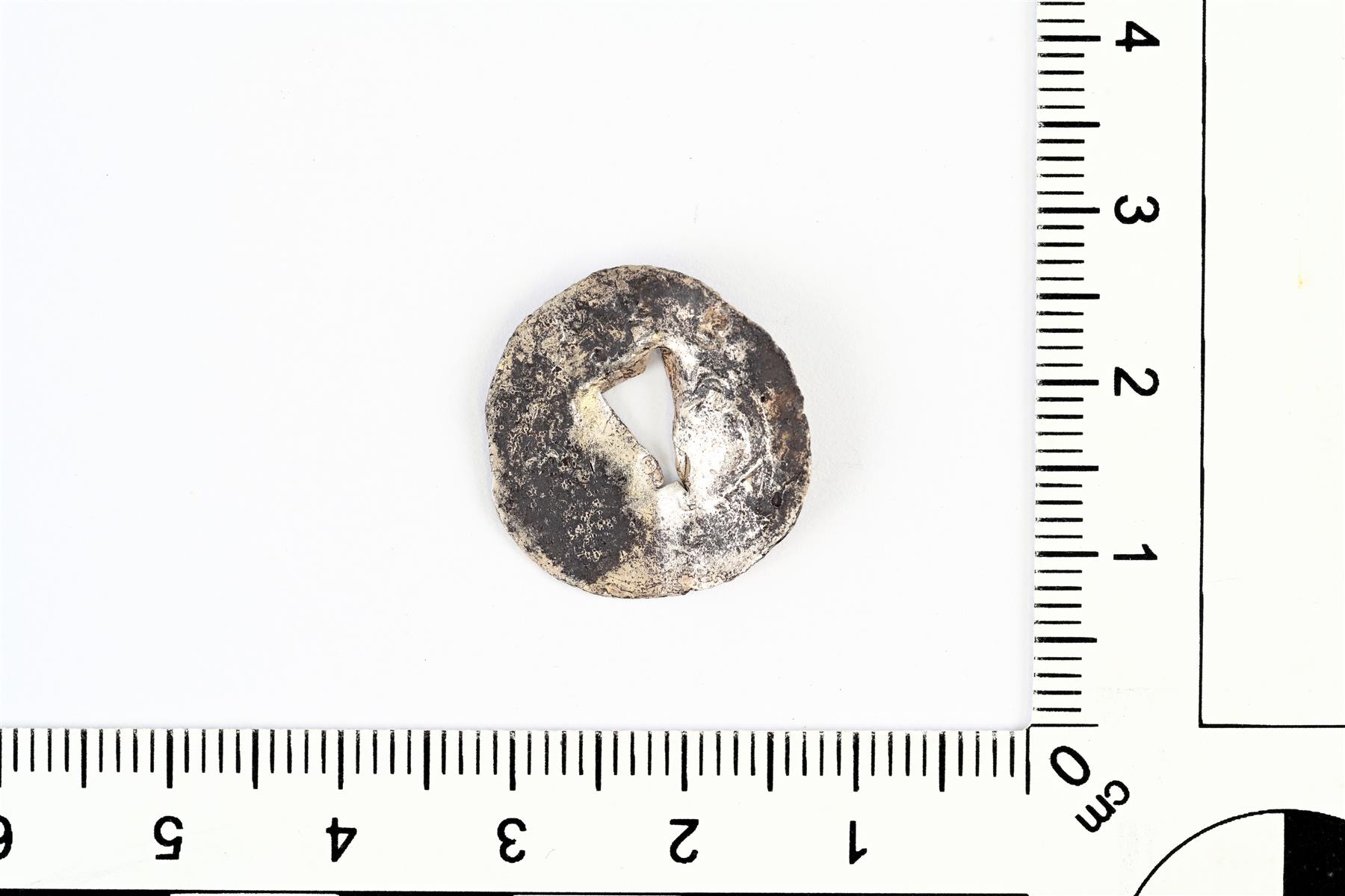 Heinrich IV, penninki, Goslar 1056–1084 (Dbg. 379). Iso reikä isketty keskelle rahaa. Reikä on kolmiomainen ja purseet taittuvat yhdelle puolelle. Todennäköisesti se on tehty veitsellä. | |