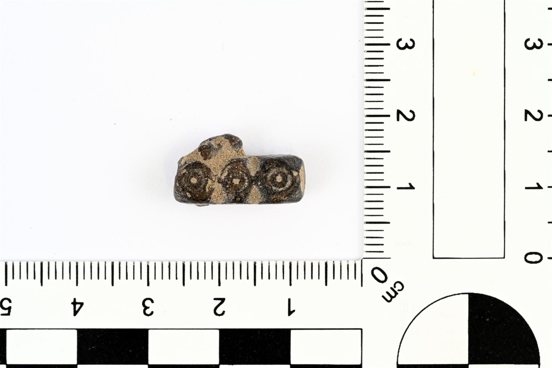 | Kolmeosainen sarjahelmi. Poikkileikkaukseltaan neliömäisten helmien kulmat on viistetty. Koristeluna on häränsilmäleimoja. Helmen sivuun on tarttunut sulanutta kupariseosta. Reikä on melko keskellä. | |