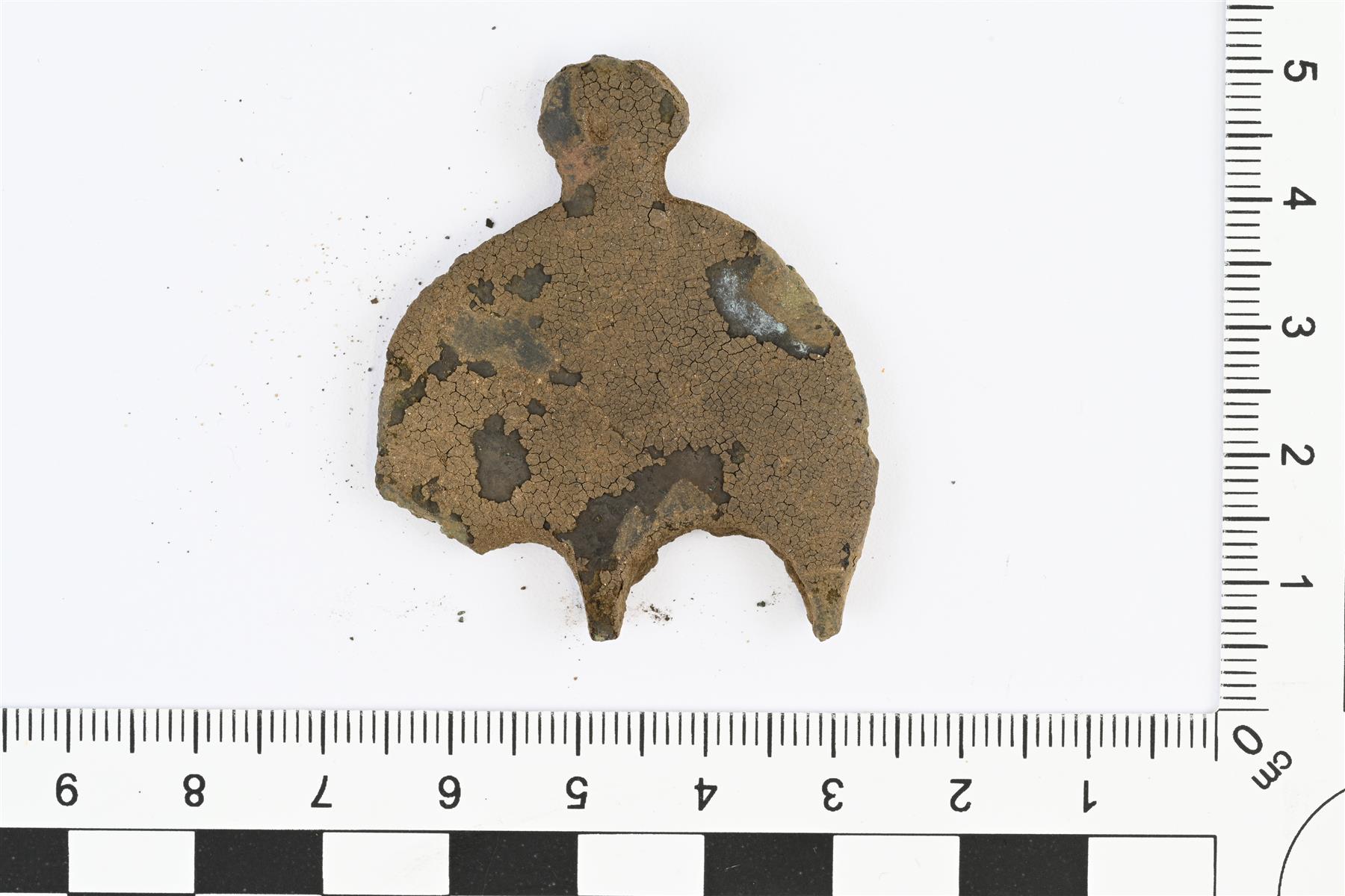 | Virolaistyyppinen ketjunkantaja. Levymäinen. Yläreuna voimakkaan kupera, ja sen keskellä litteä pyöreäpäinen uloke, jonka toisella pinnalla lenkin katkelma. Alareunasta erkanee kolme sakaraa, joiden välit pyöristetty koveraksi. Sakaroiden päät katkenneet. Samantapainen, joskaan ei identtinen kuin Kivikoski 1051, Taf. 89, Abb. 718. Paksuus mitattu lenkin kohdalta, levyn paksuus 3 mm. | |